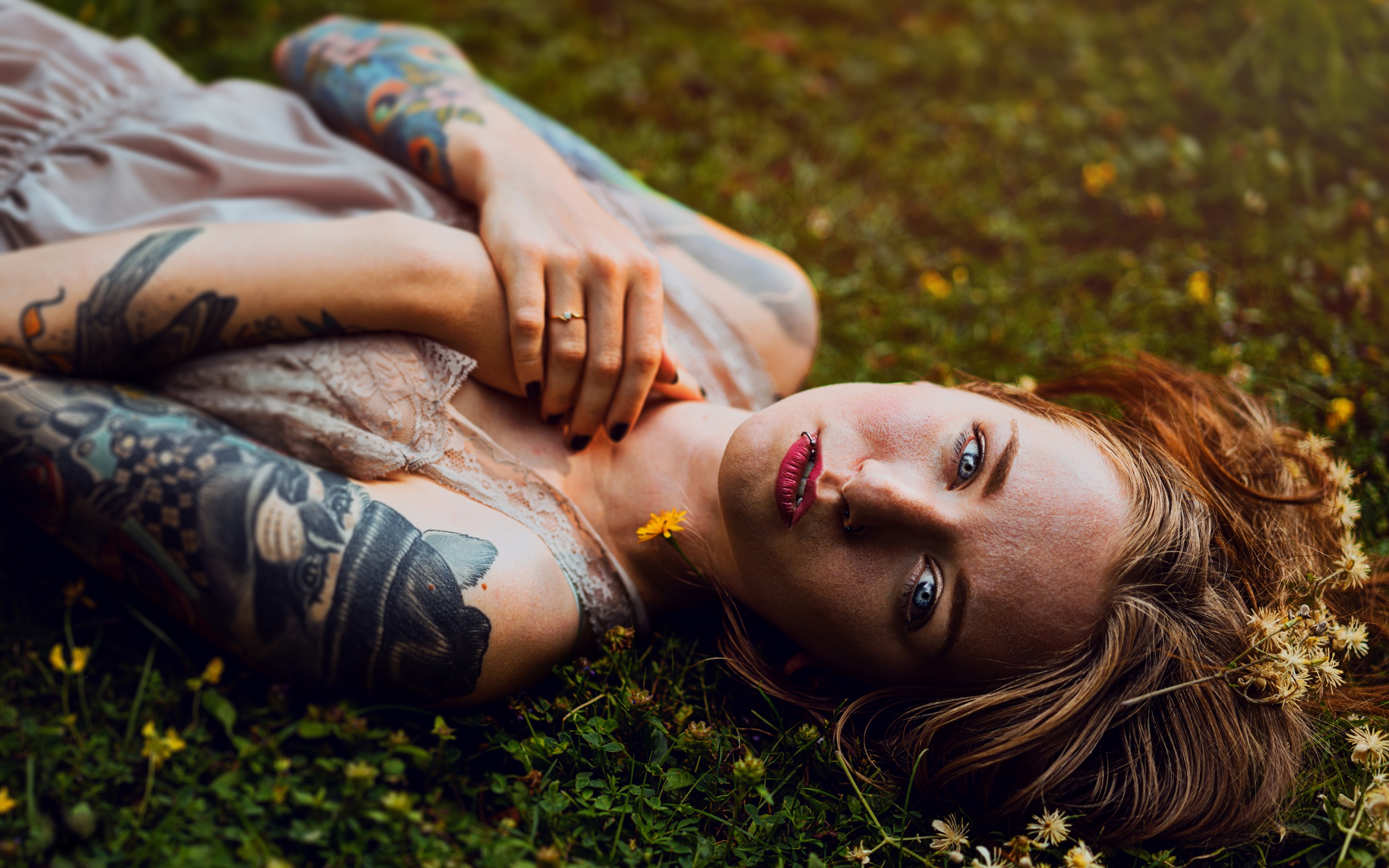 Description: A woman with tattoos laying on the ground in the grass with her arms around her body and head.