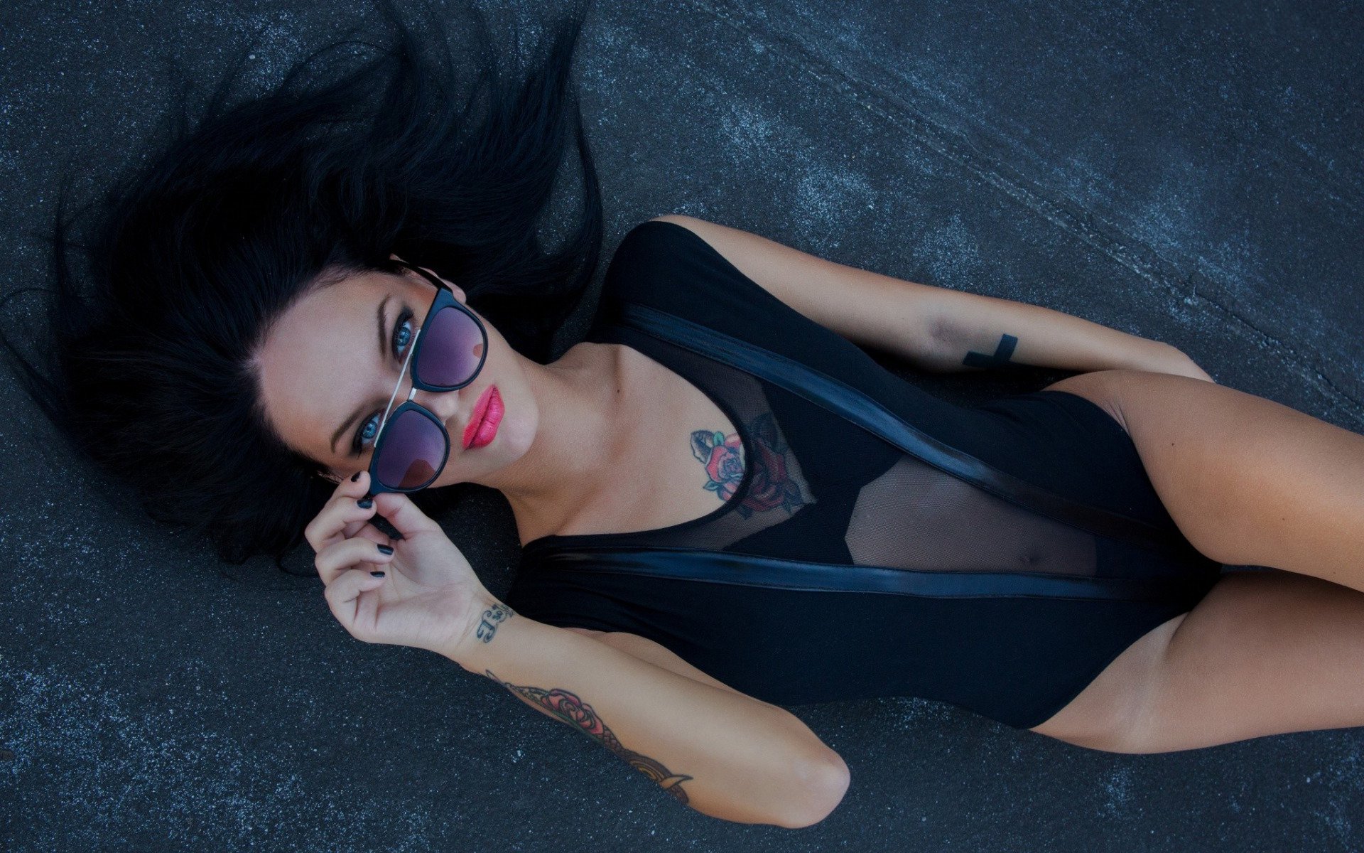 Description: A woman with tattoos and sunglasses laying on the ground with her hand on her face and her arm behind her head.
