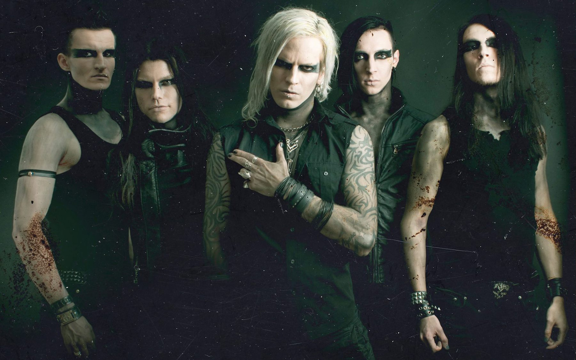 Description: A group of people with tattoos and piercings standing together in a dark room with their hands together and looking at the camera.