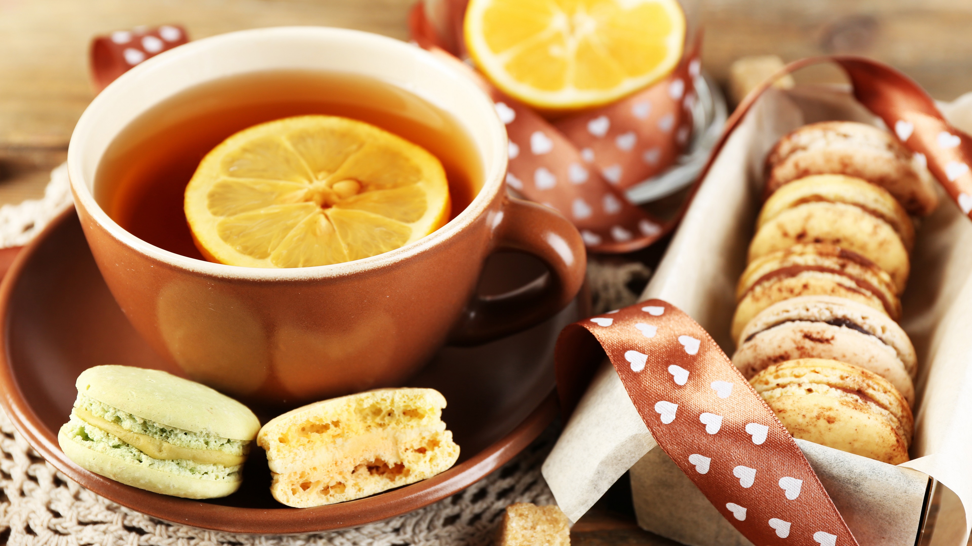 Description: A cup of tea and some cookies on a plate and a napkin and a bowl of cookies and a tea bag.