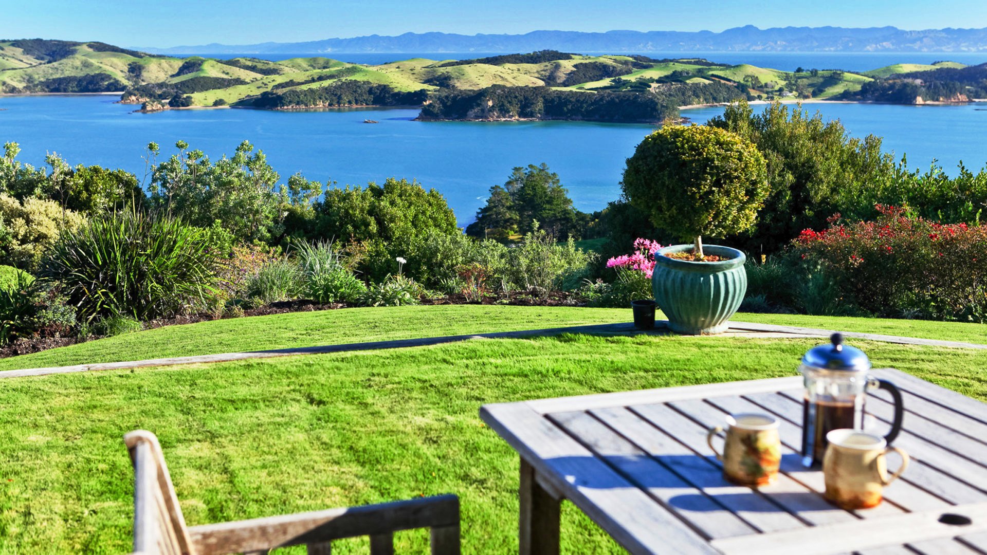 Description: A table with a tea pot and a cup on it in a grassy area overlooking a lake and mountains.