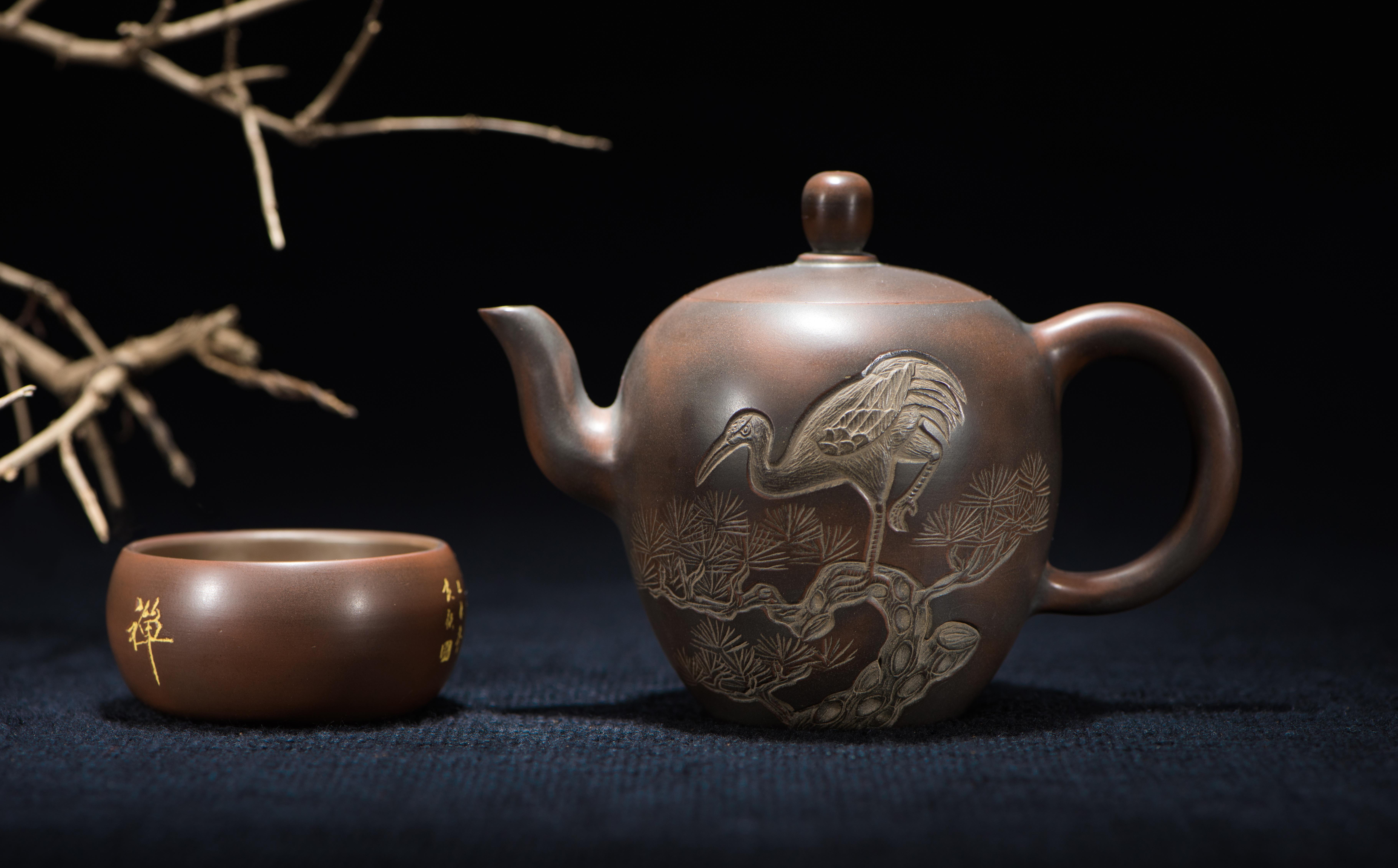 Description: A teapot and a cup sitting on a table next to a tree branch with branches in the background.