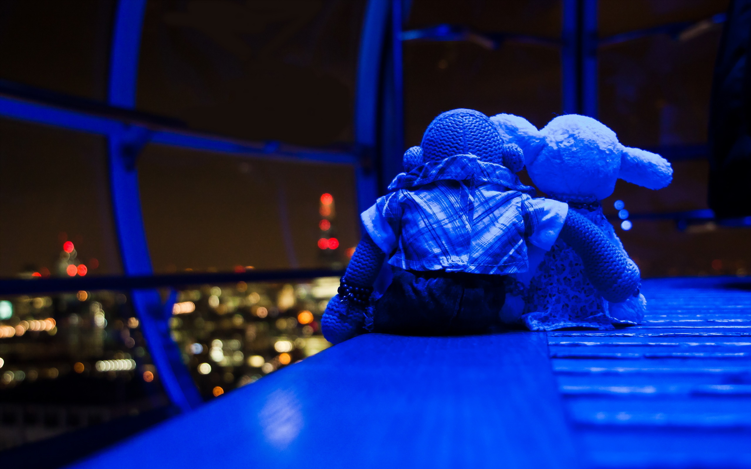 Description: A teddy bear sitting on a ledge in a building at night with a city view in the background and a blue light.