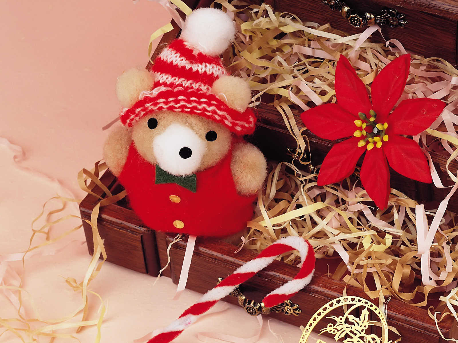Description: A teddy bear in a red hat and a red and white striped scarf sitting in a wooden box with a candy cane.