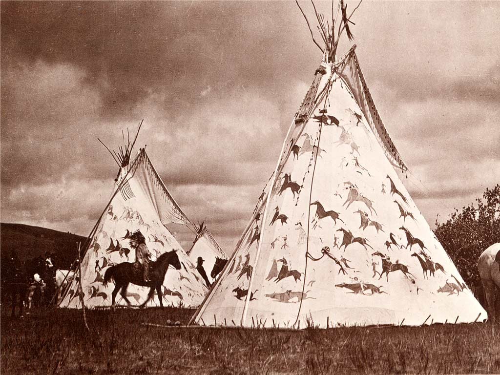 Description: A teepee with horses and birds painted on it and a man standing next to it with a horse.