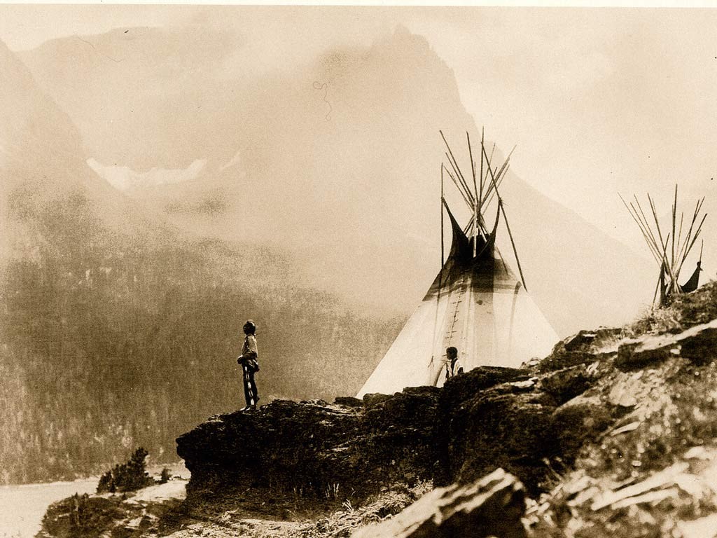 Description: A teepee sitting on top of a mountain next to a forest filled with trees and mountains in the background.