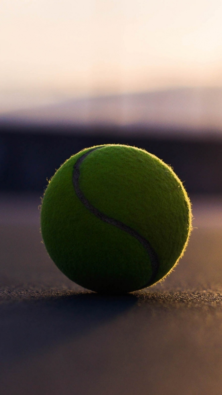 Description: A tennis ball is sitting on the ground with a blurry background of the tennis court and sky in the background.