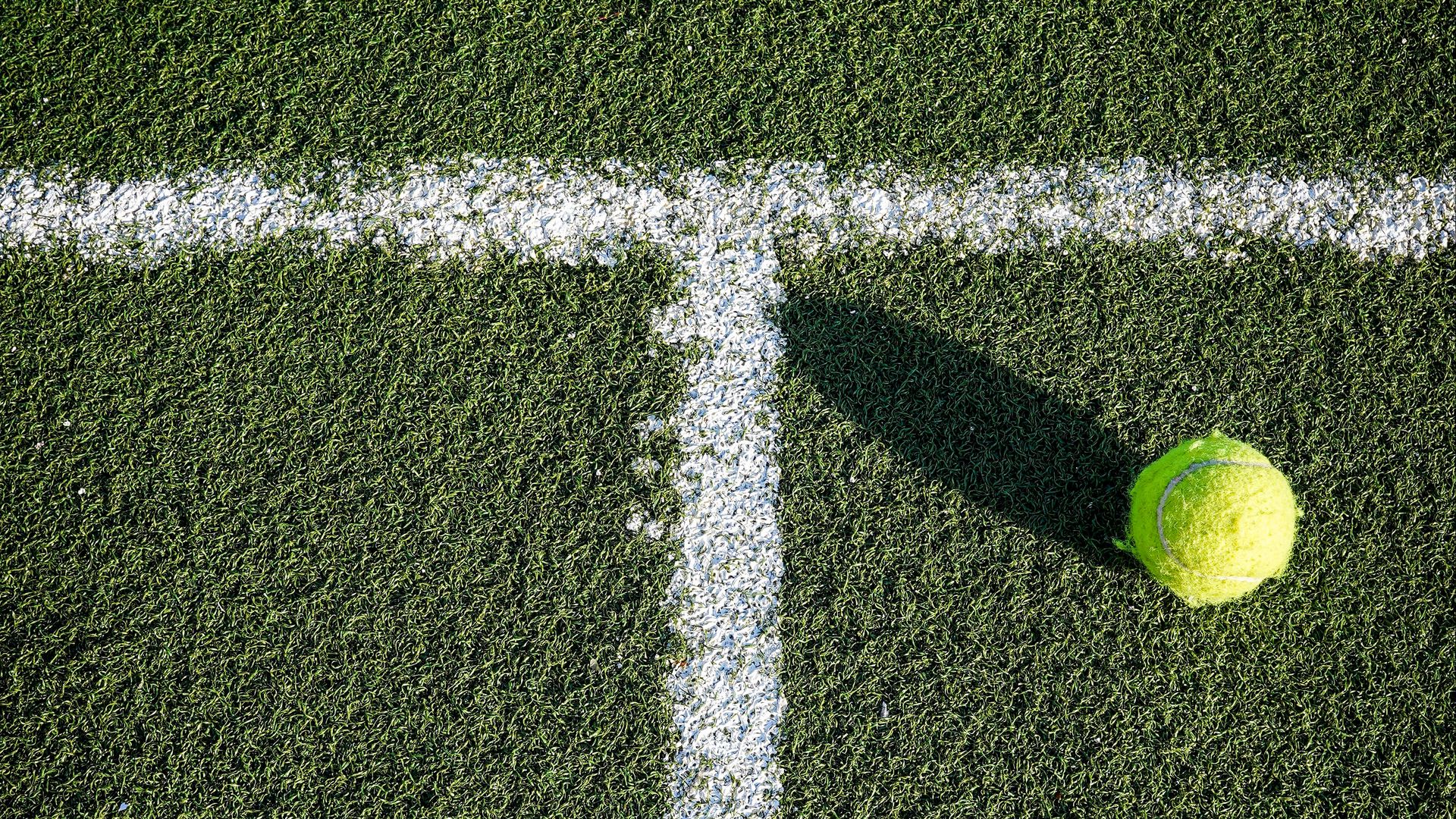 Description: A tennis ball on a tennis court with white lines and grass in the background.