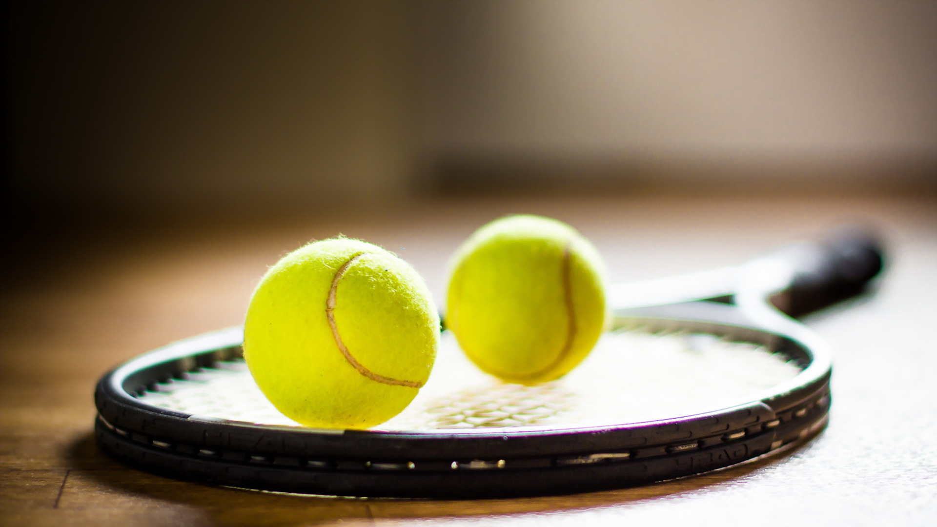 Description: Two tennis balls on a racket on a table with a tennis ball in the background and a tennis racket on the floor.