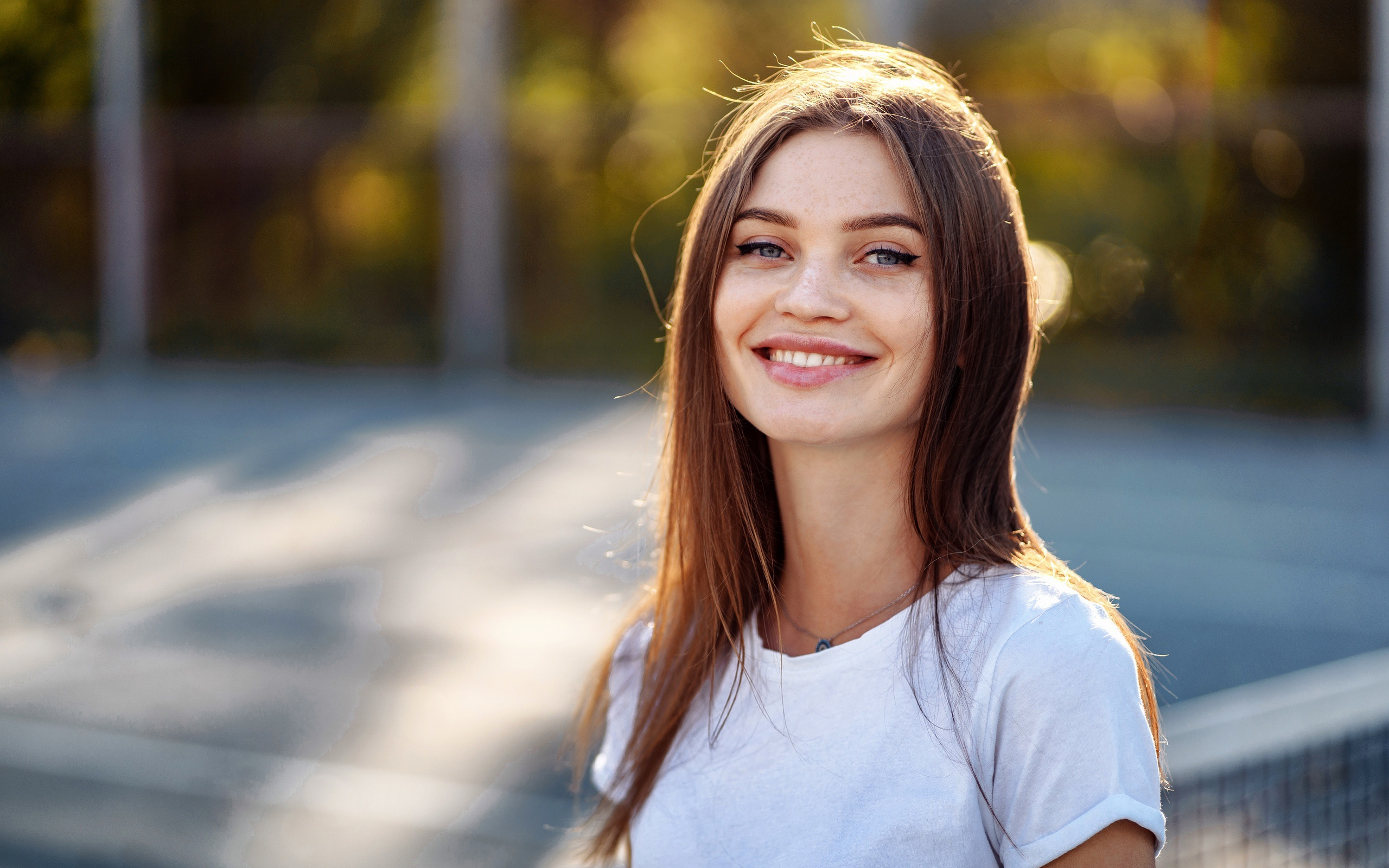 Description: A woman standing on a tennis court with a tennis racket in her hand and smiling at the camera.
