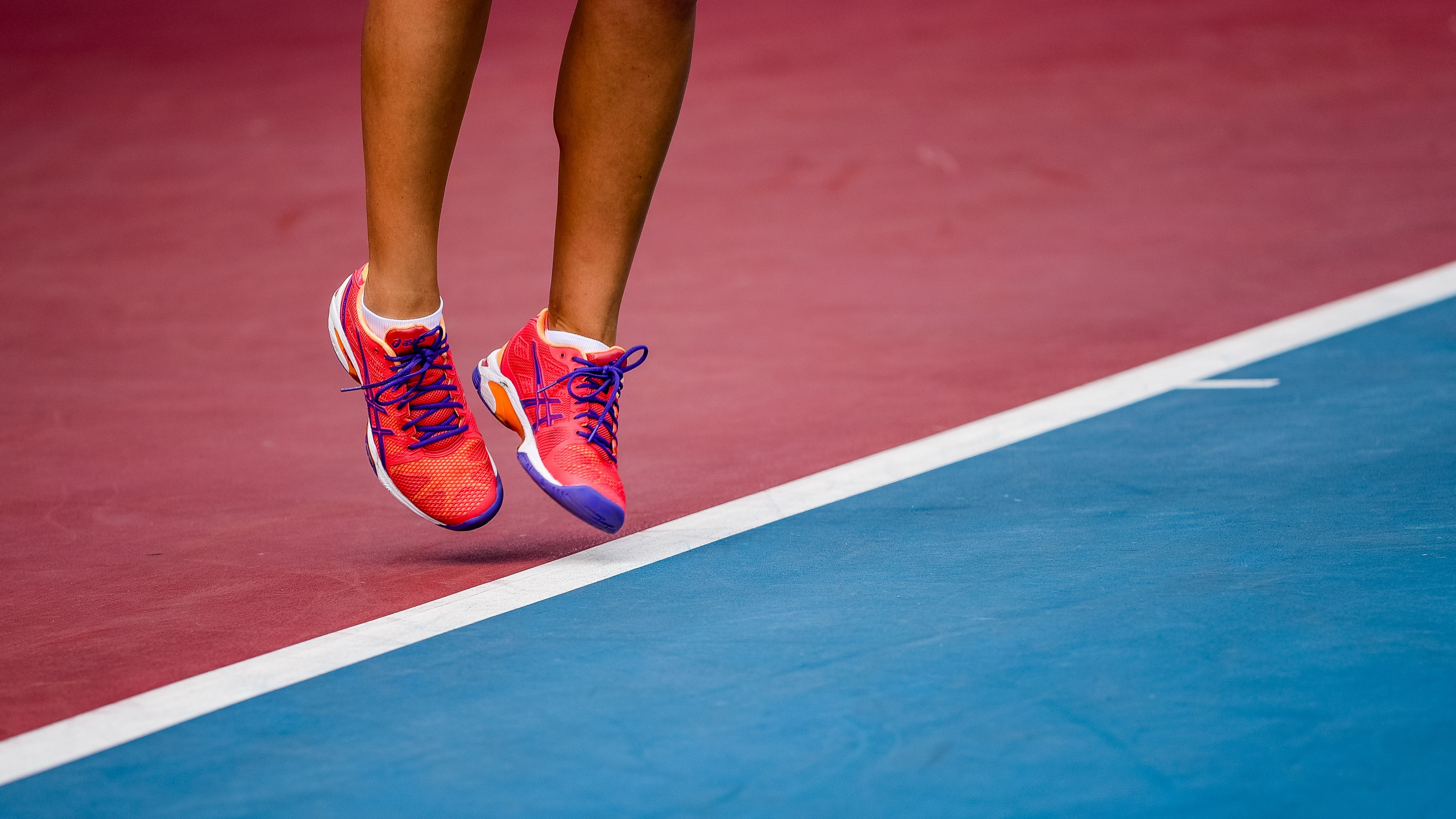 Description: A person jumping up in the air on a tennis court with a tennis racket in their hand and a tennis ball in the air.