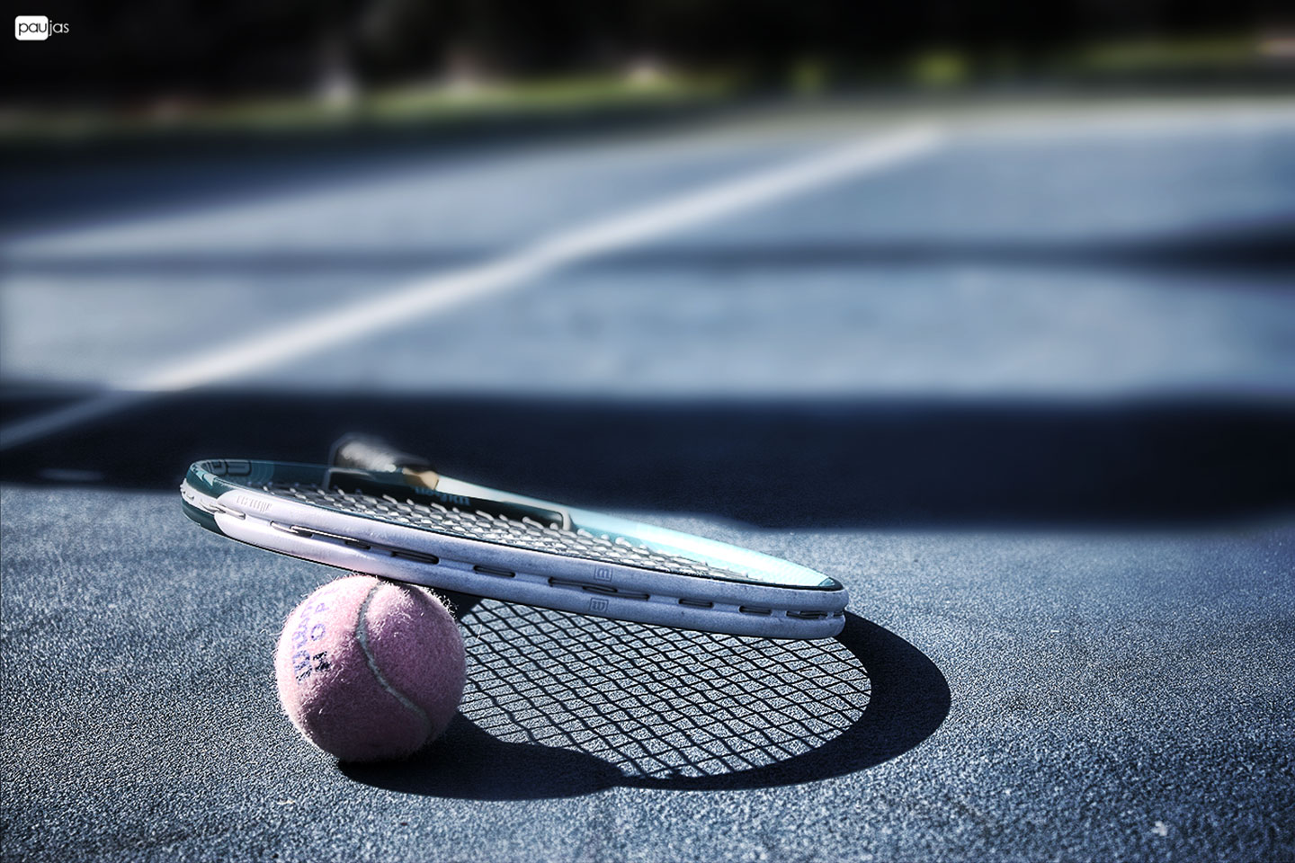 Description: A tennis racket and a ball on the ground in the sun on a tennis court in the background.