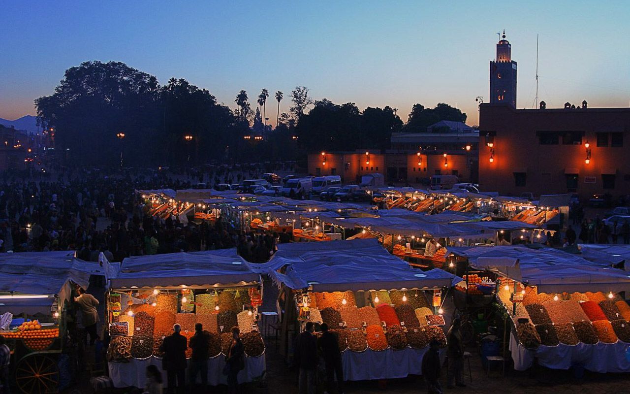 Description: A group of tents with lights on them in a field at night with a clock tower in the background.