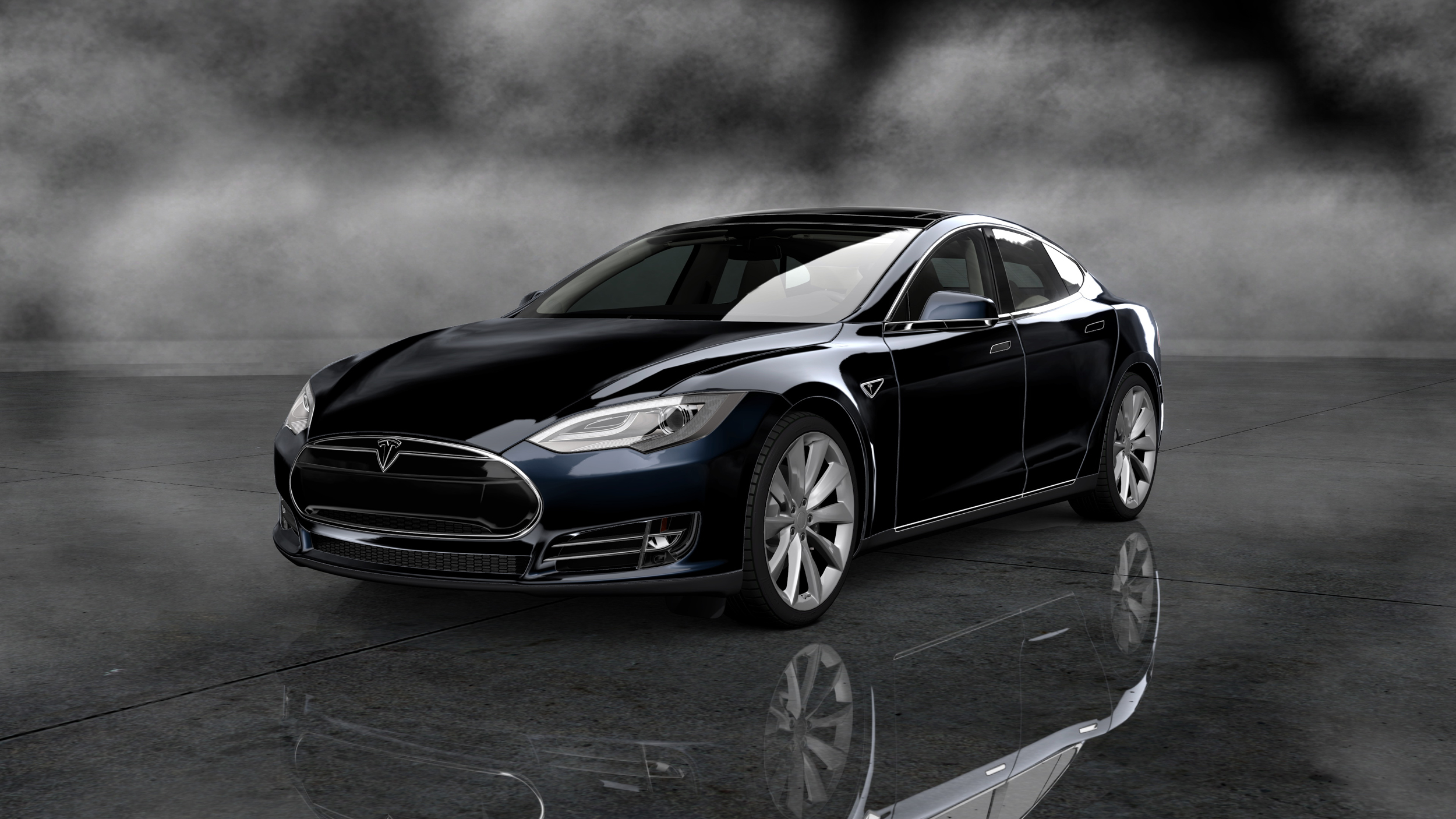 Description: A black and white photo of a tesla car in a dark room with a reflective surface on the floor.