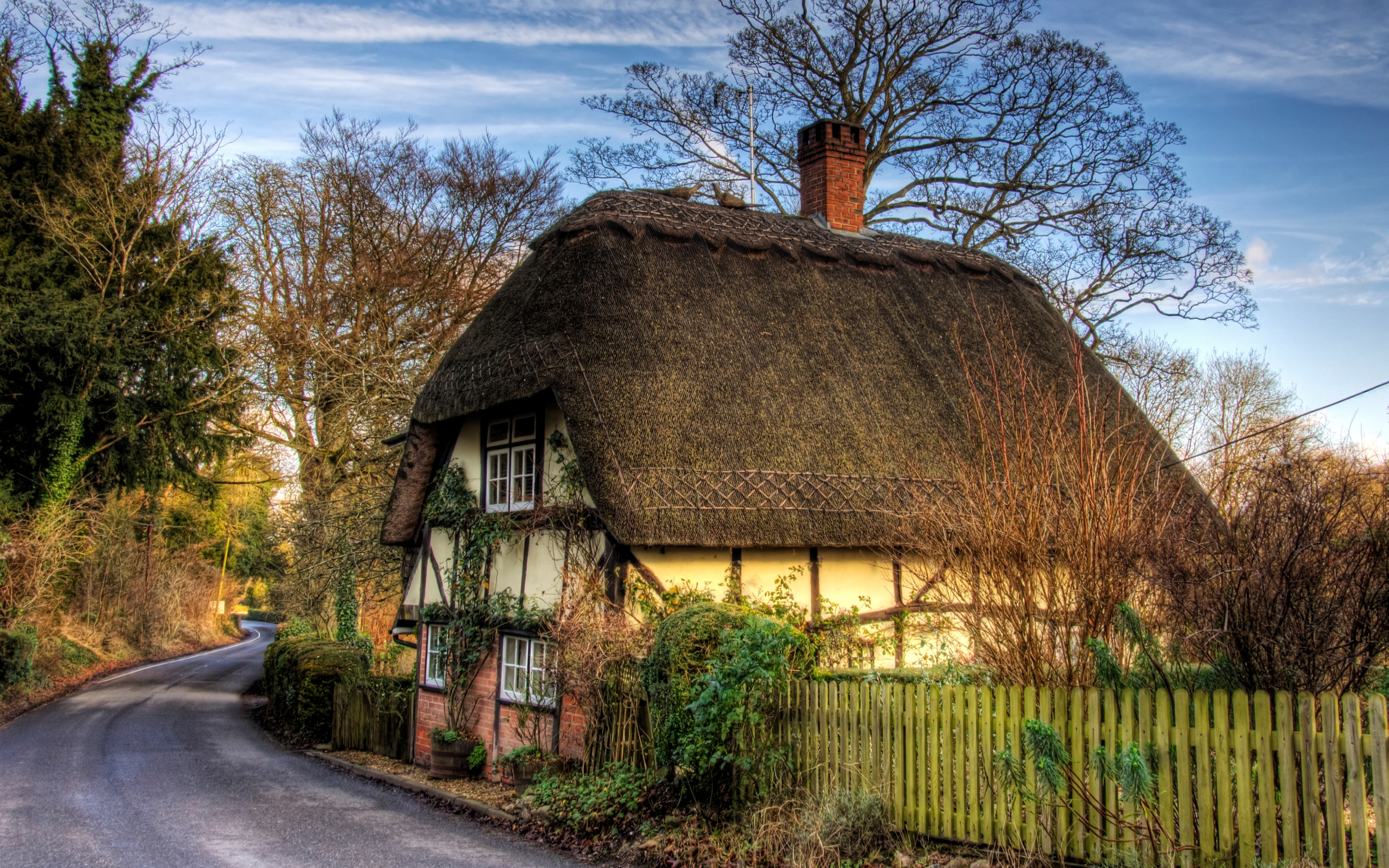 Description: A thatched roof house with a fence and a road in front of it and a green gate and trees.