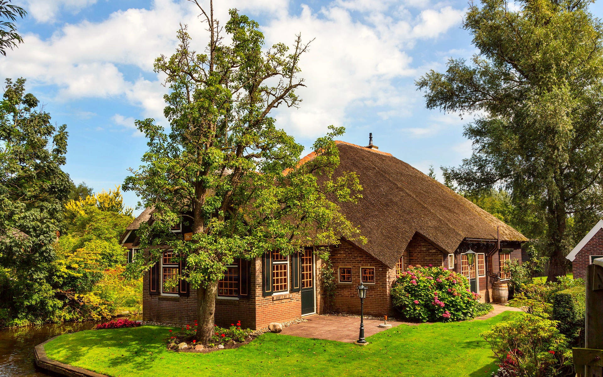 Description: A house with a thatched roof and a garden area next to a river and trees with flowers and bushes.