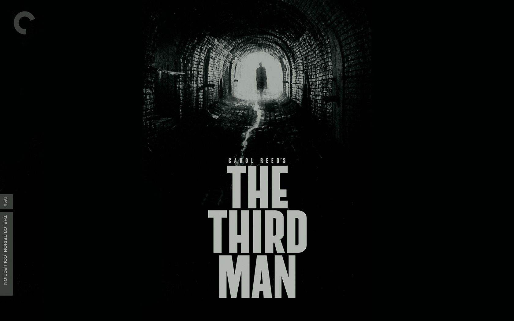 Description: A movie poster for the third man with a man in a tunnel in the background and a man in the middle.