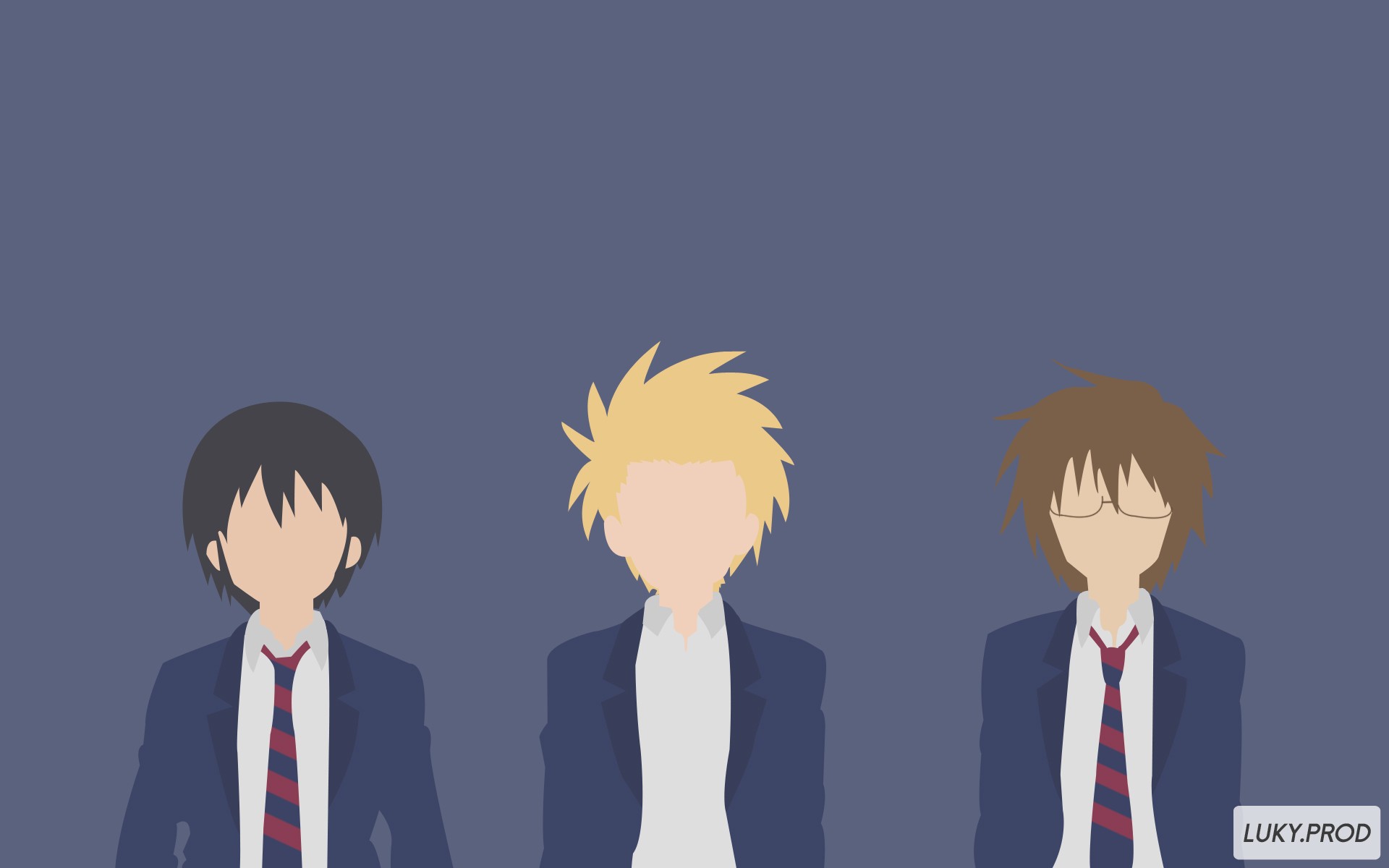Description: Three anime characters are standing in a row with their heads turned to the side.