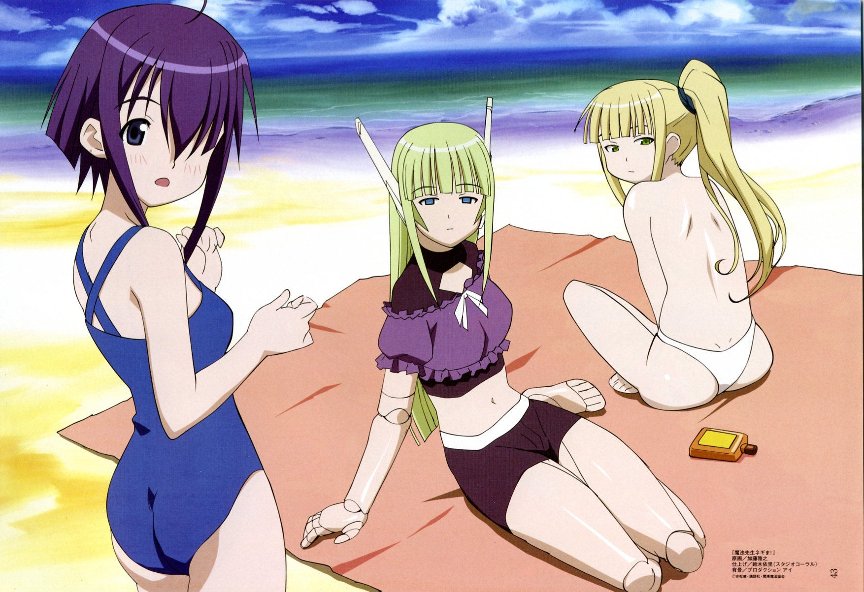 Description: Three anime girls sitting on a beach with a bottle of beer in their hand and one girl in a bathing suit.
