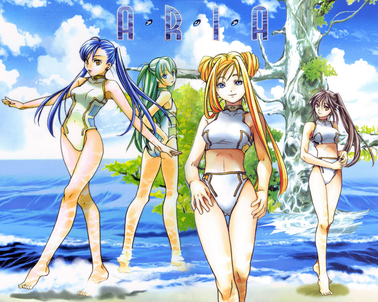 Description: Three anime girls standing on a beach next to a tree and water with a sky background and a tree in the background.