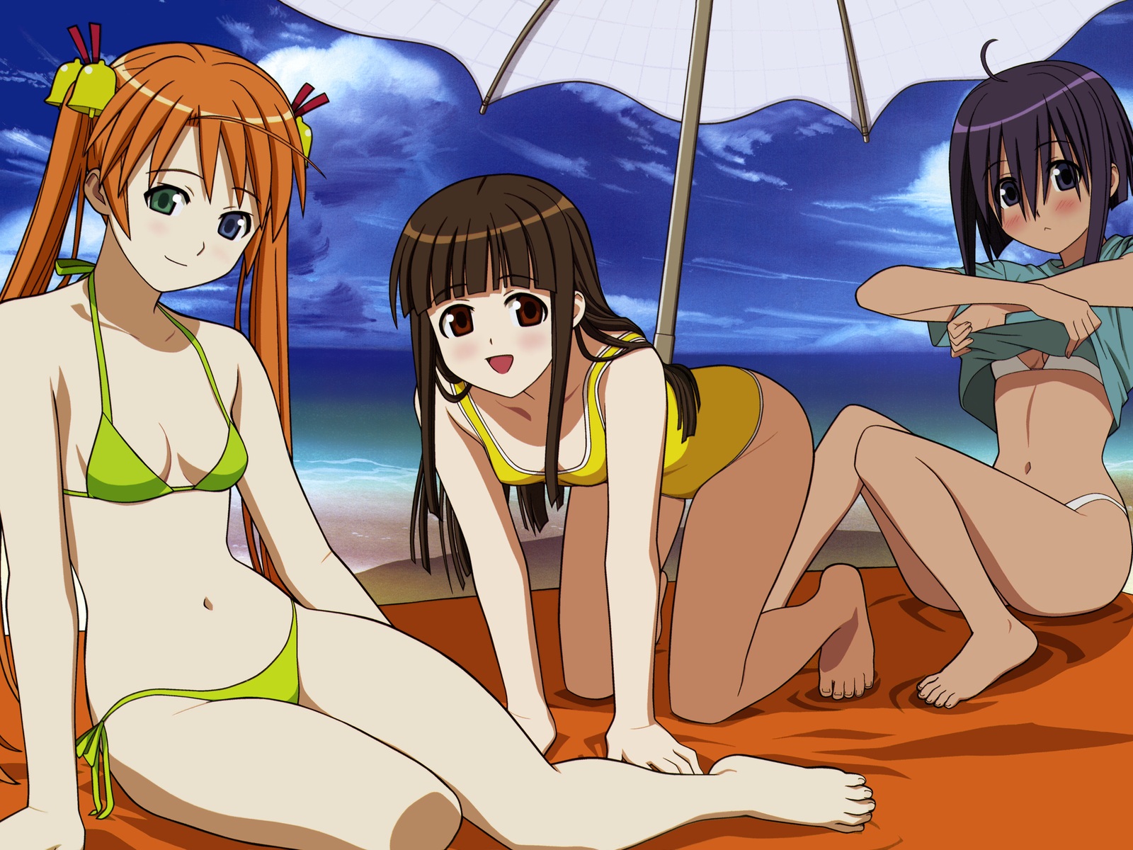 Description: Three anime girls are sitting on the beach under an umbrella and posing for a picture together.