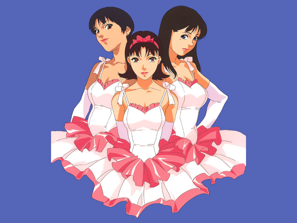 Description: Three anime girls in white dresses with pink bows on their heads and one girl in a pink dress with a bow on her head.