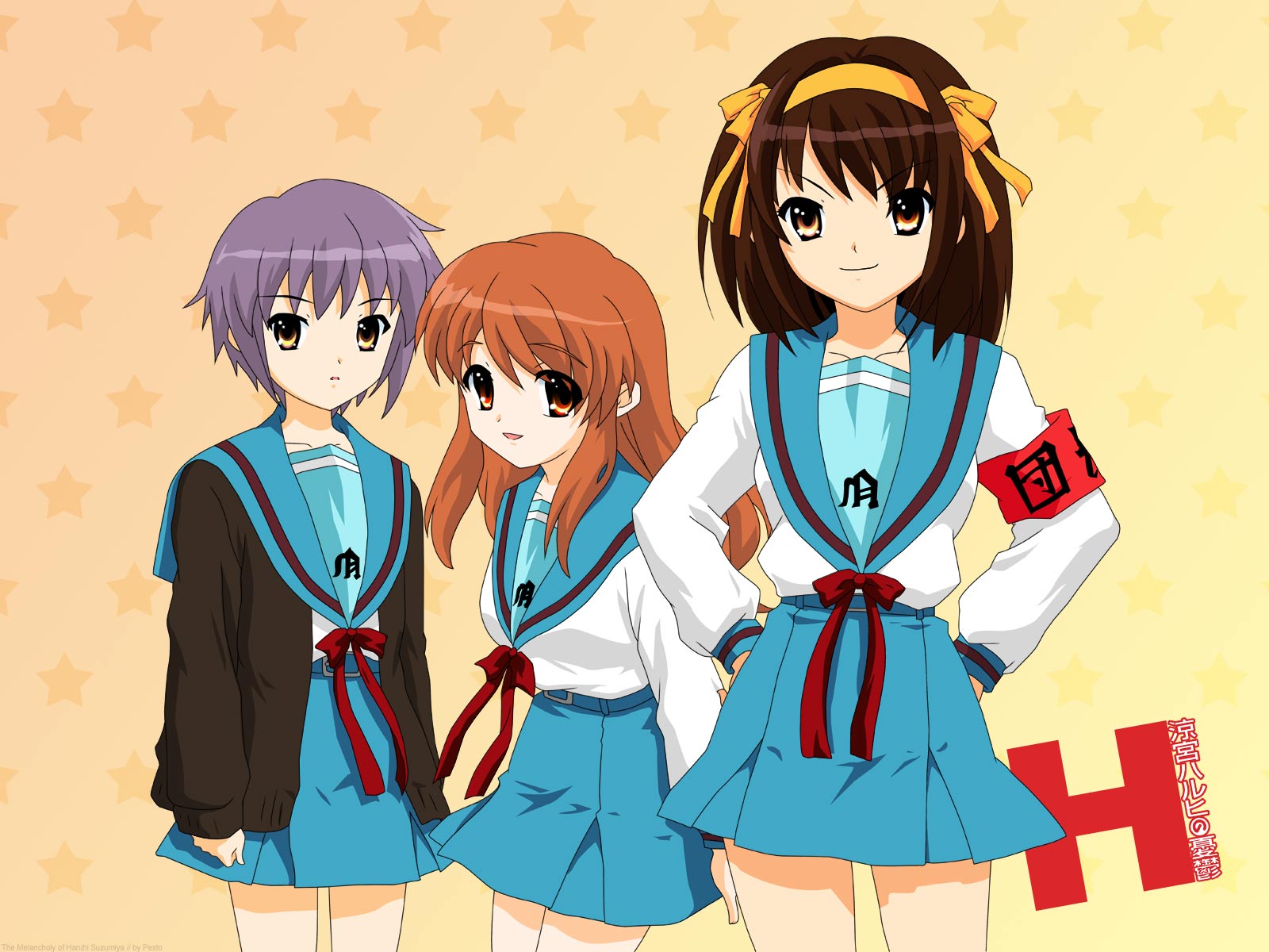 Description: Three anime girls standing next to each other in front of a star background with a red ribbon around their waist.