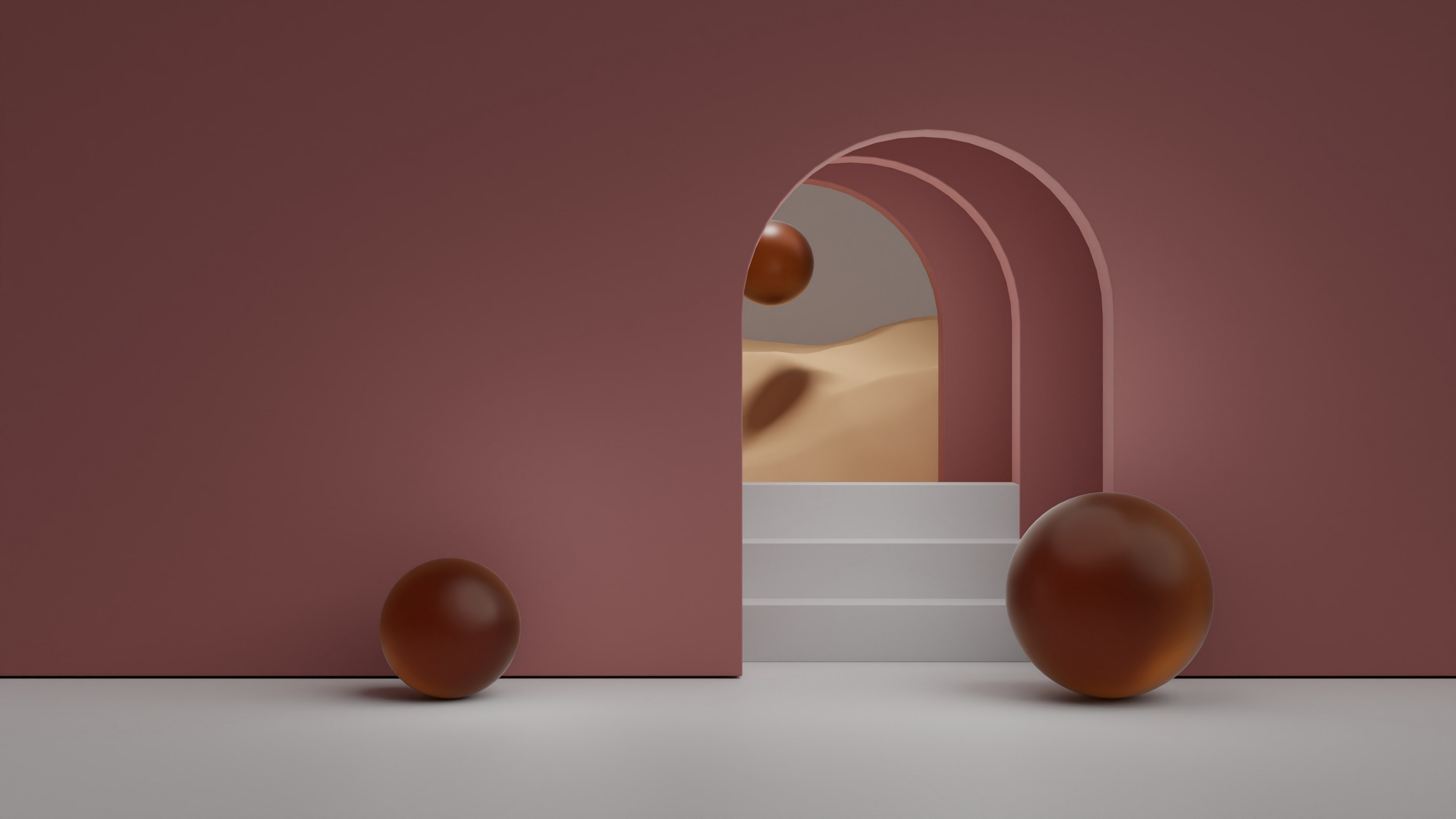 Description: A group of three balls sitting in front of a doorway with a pink wall behind it and a white chair.