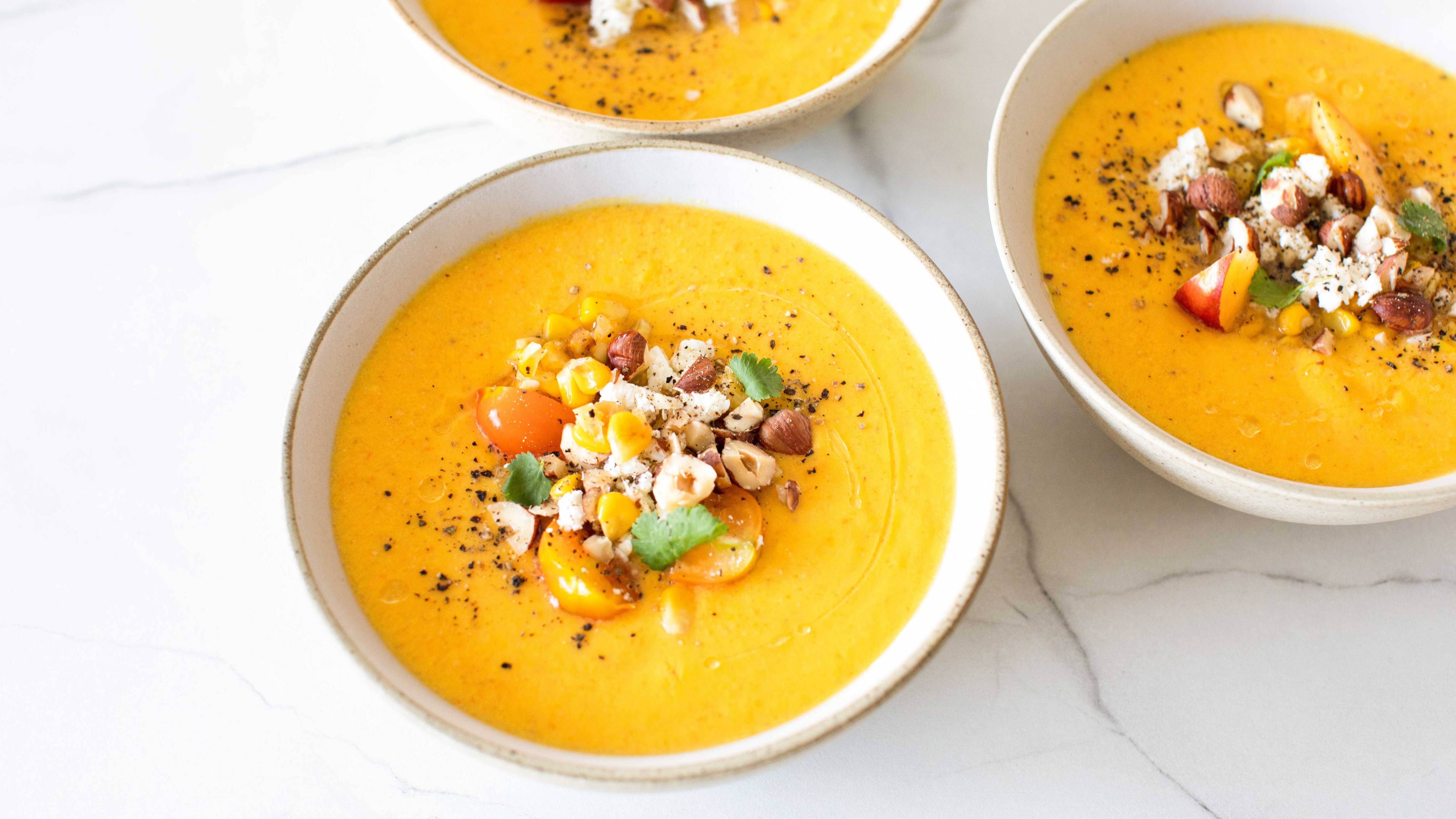 Description: Three bowls of soup with a variety of toppings on top of them on a white table top with a marble surface.