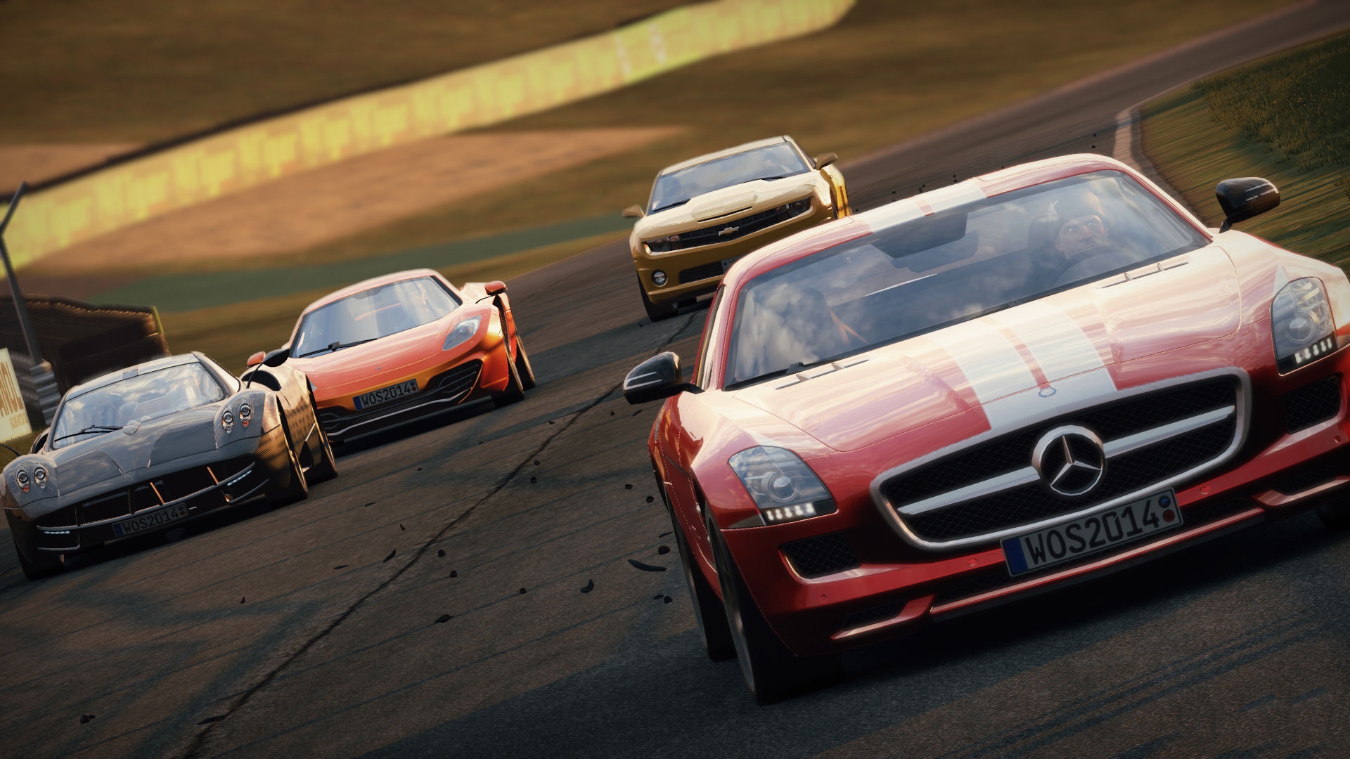 Description: Three cars driving on a race track with grass in the background and a yellow car behind them on the opposite side of the track.
