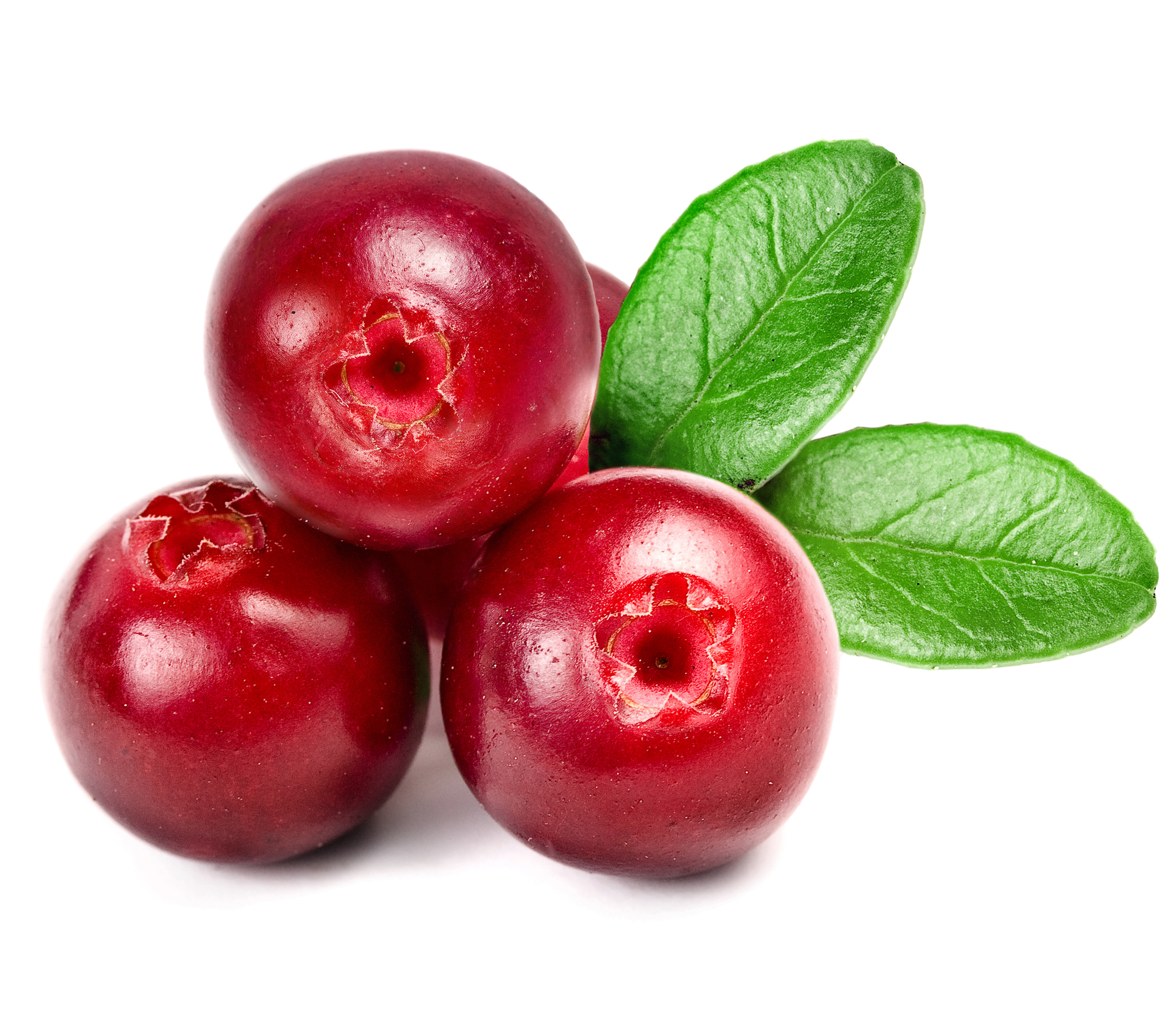 Description: Three cherries with leaves on a white background with a green leaf on top of them and a few other cherries.