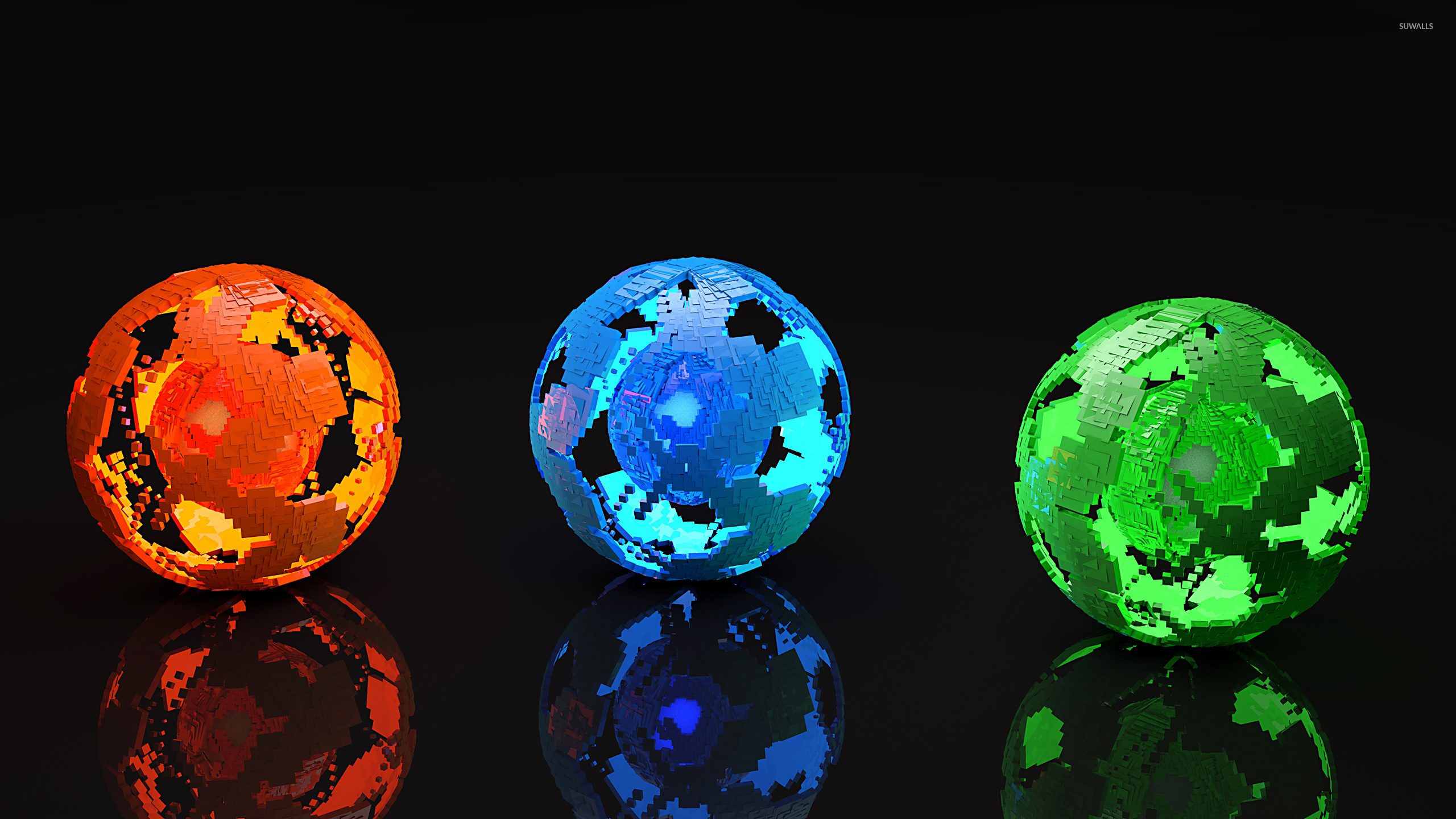 Description: Three different colored balls are shown in a row on a black surface with a reflection of them on the surface.