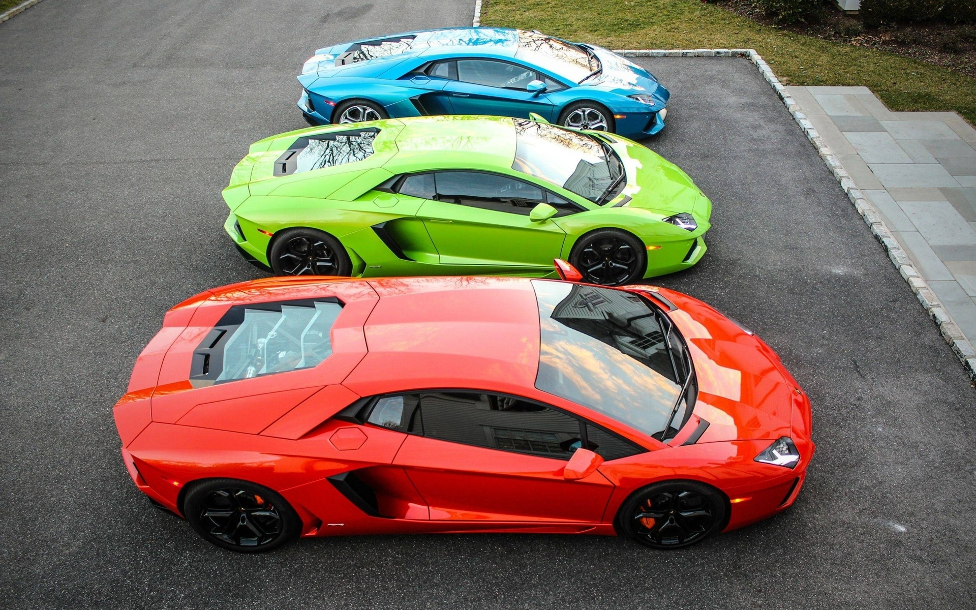 Description: Three different colored cars parked in a parking lot next to each other on a street with grass and bushes.