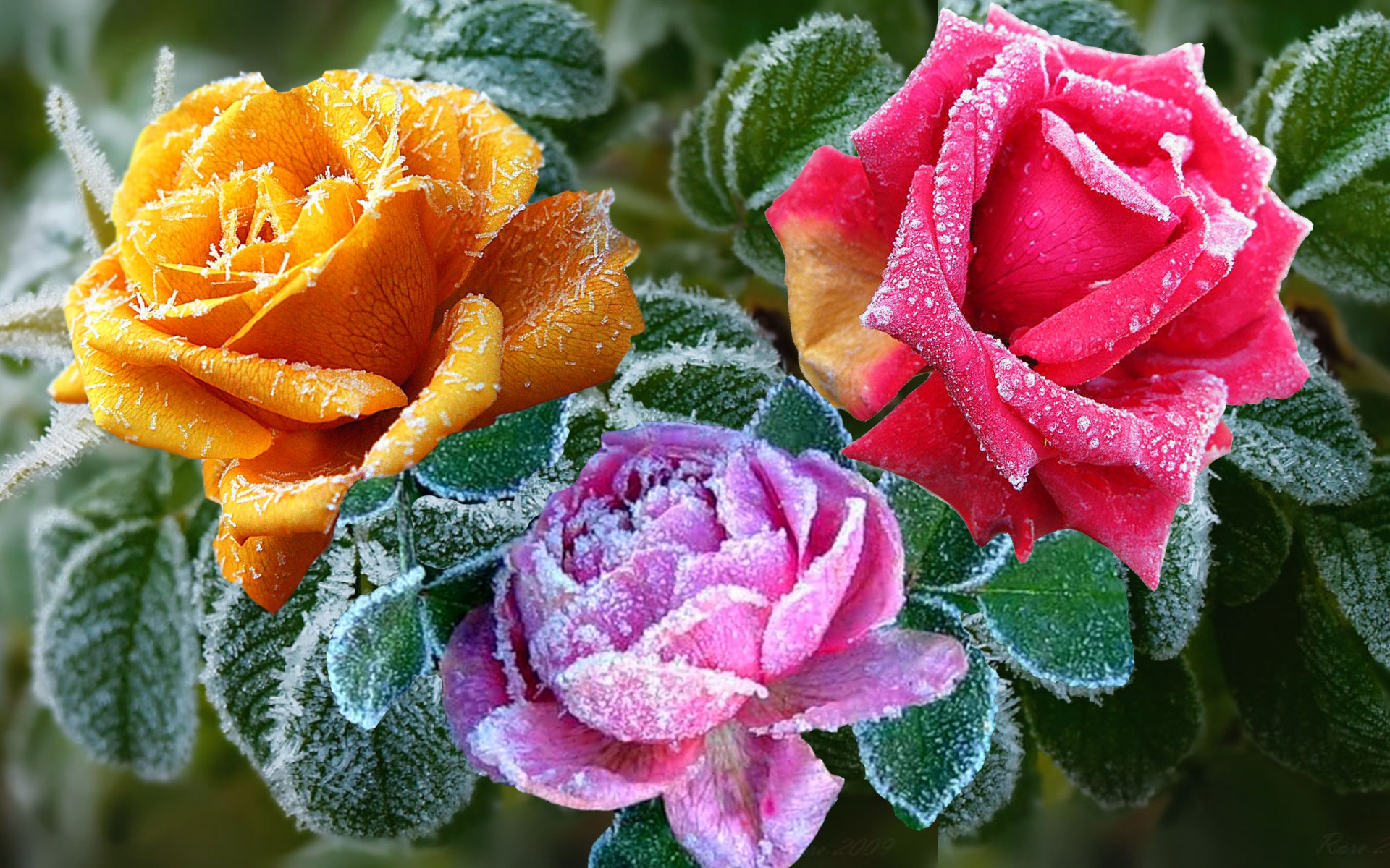 Description: Three different colored flowers with green leaves and drops of water on them.