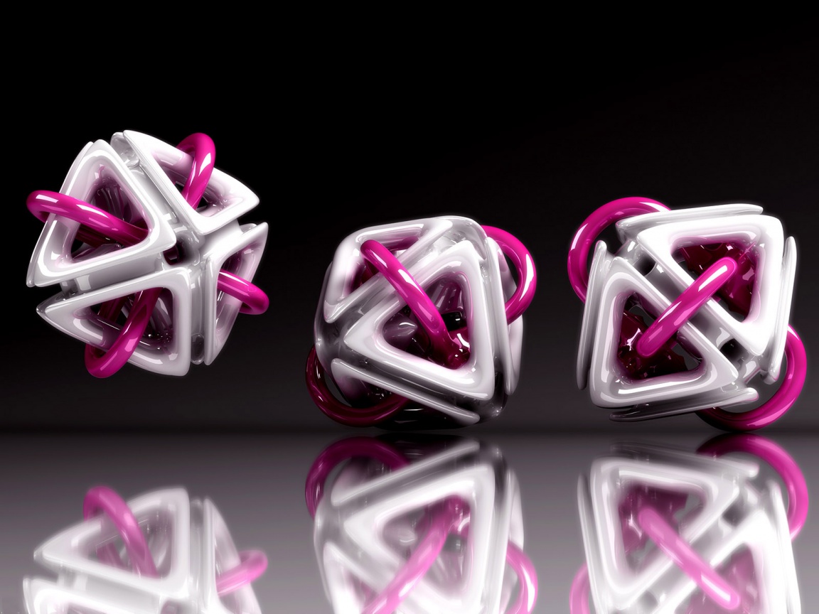 Description: Three different colored objects are shown in a row on a reflective surface with a black background and a reflection.
