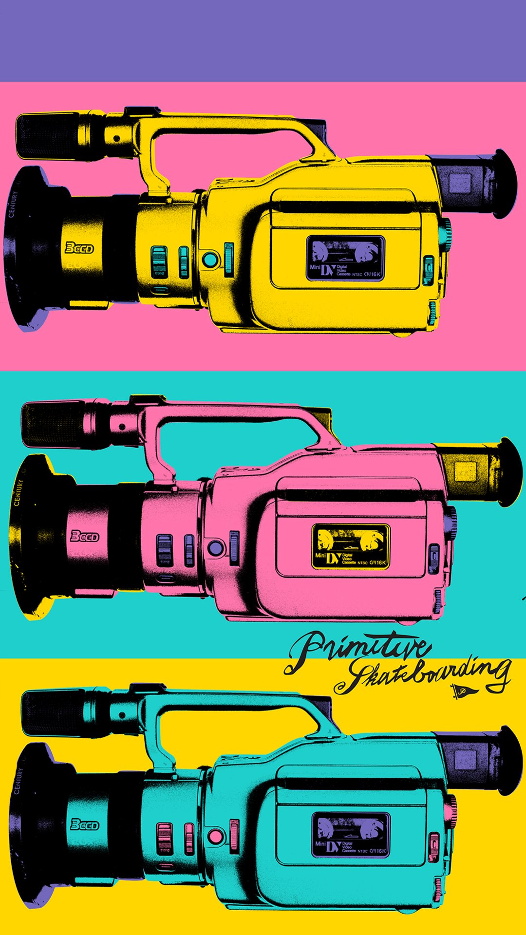Description: A group of three different colored objects in a row on a colorful background with a black outline on the bottom.
