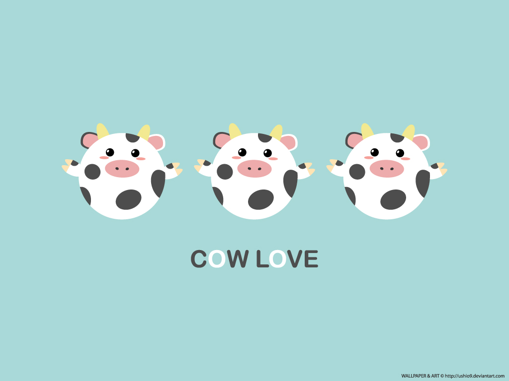 Description: Three cows with horns and the words cow love written below them on a blue background with the word cow love written below them.