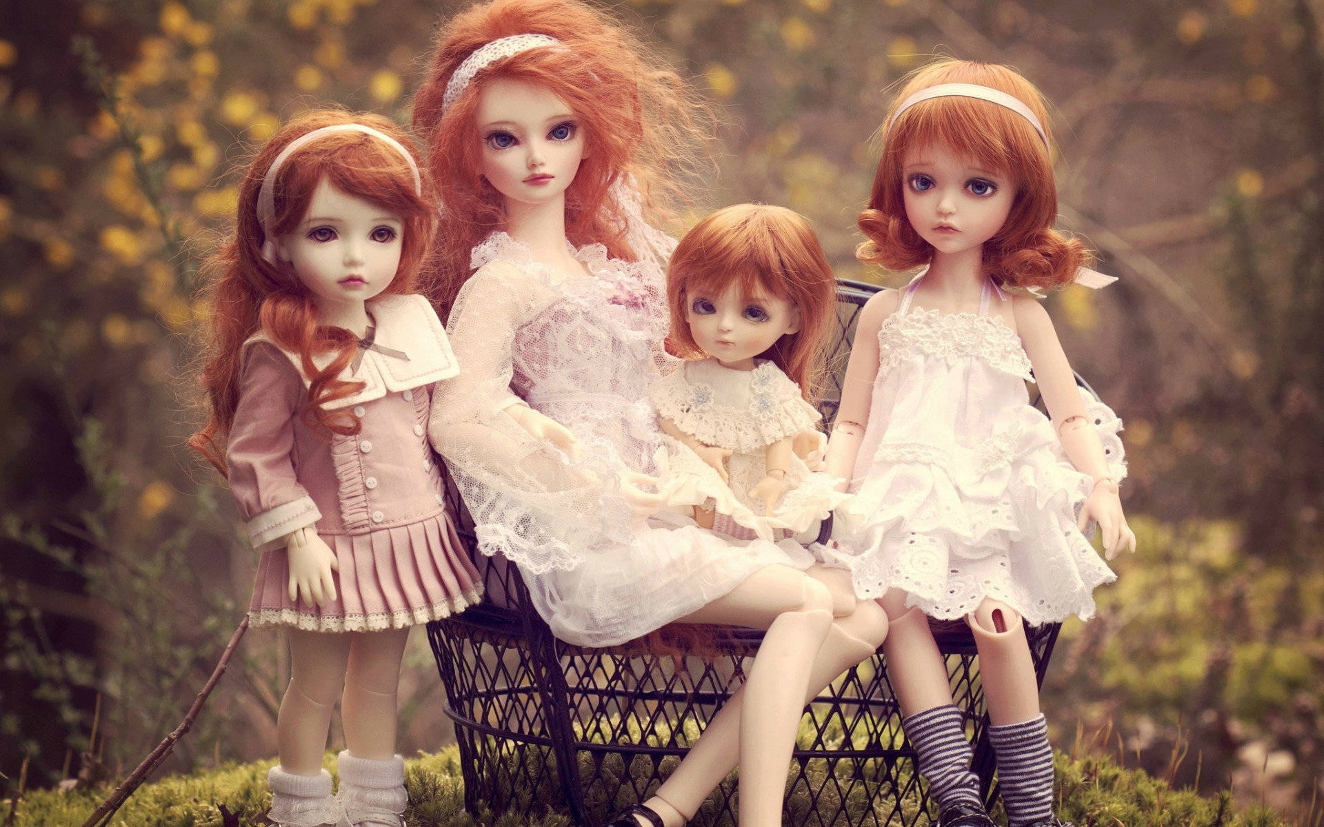 Description: Three dolls sitting on a basket in the woods with trees in the background and grass in the foreground.