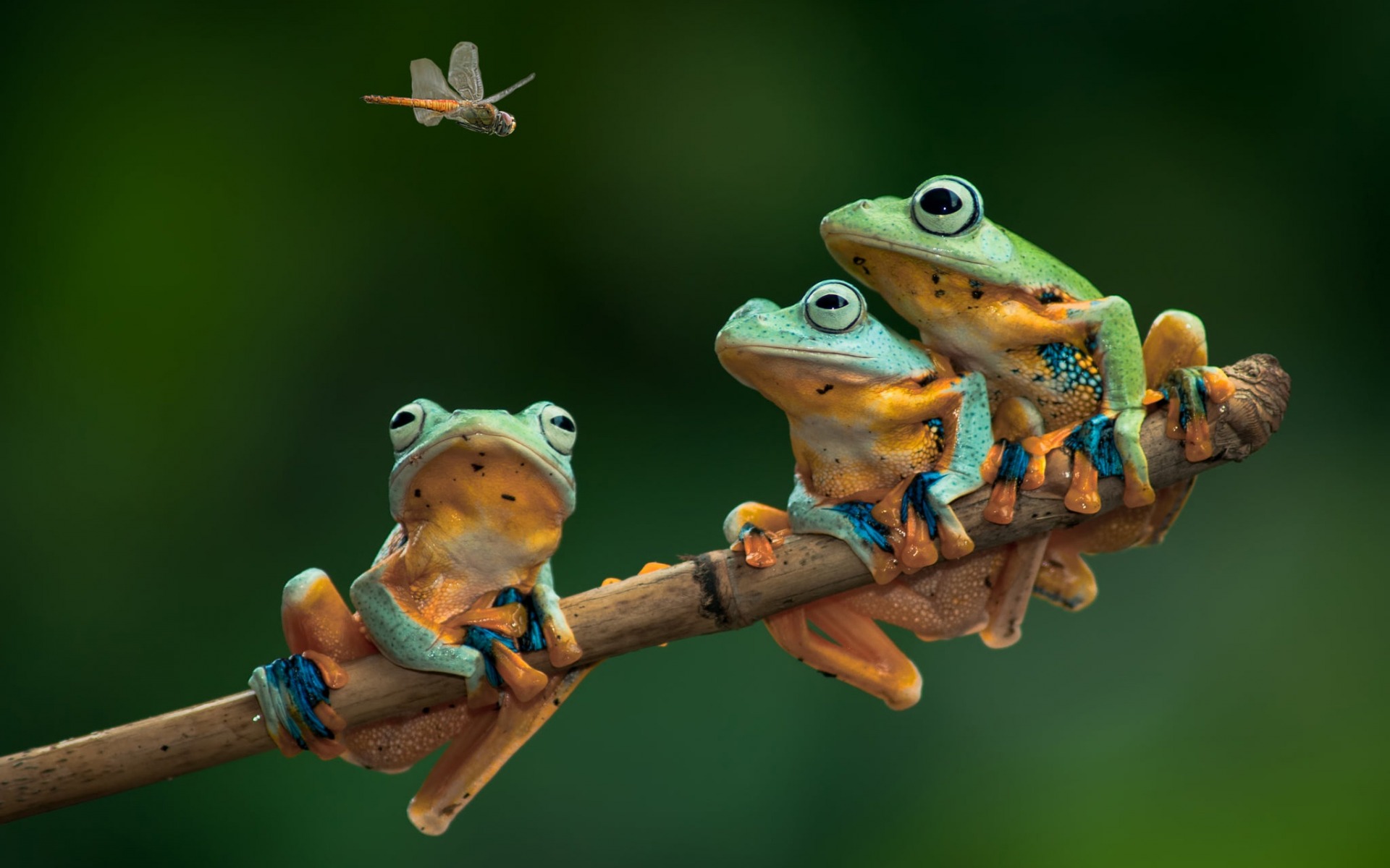 Description: Three frogs sitting on a branch with a dragon flying in the background and a small bird flying in the air.
