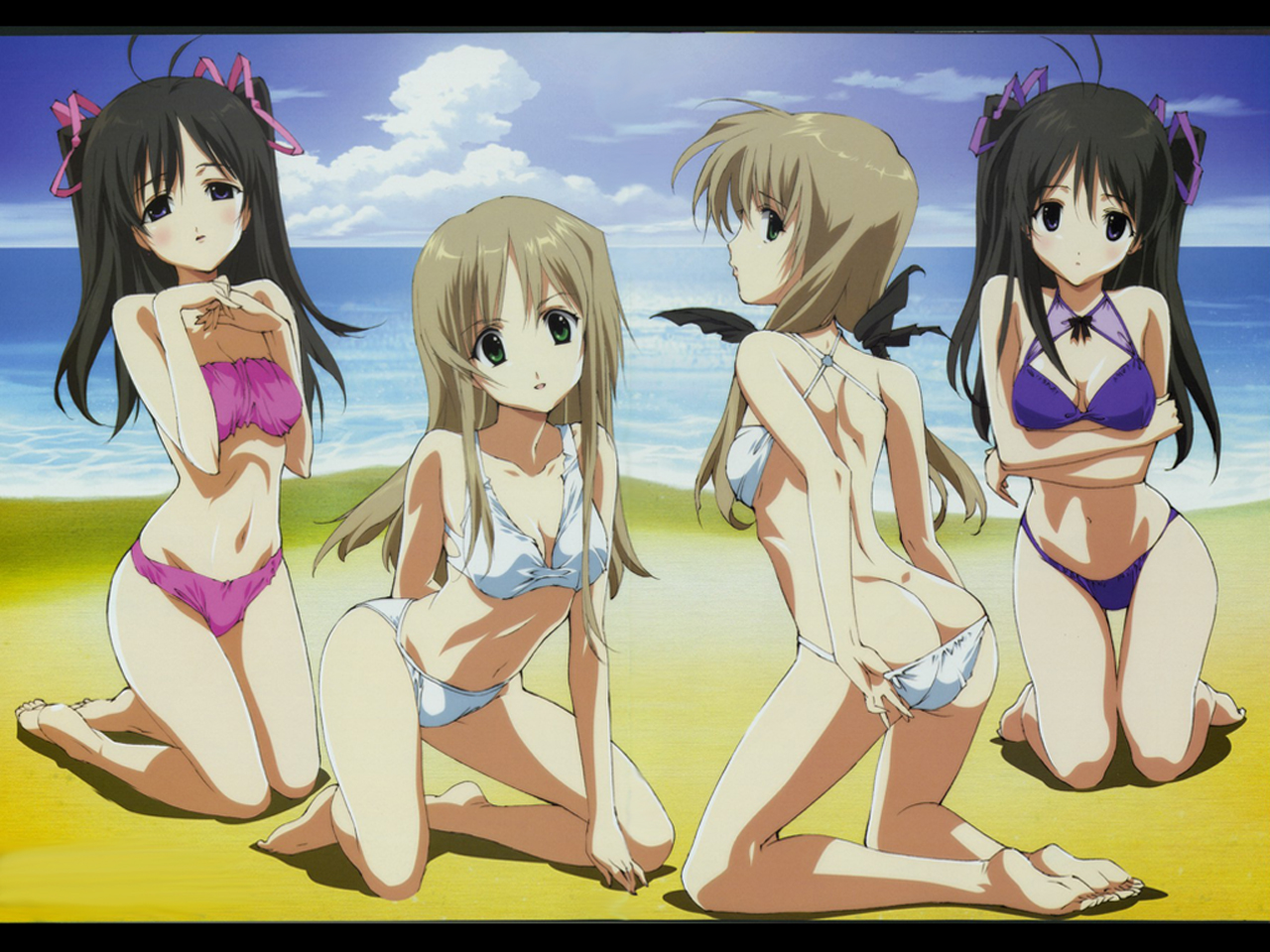 Description: Three girls in bikinis sitting on the beach with a sky background and a blue sky in the background.