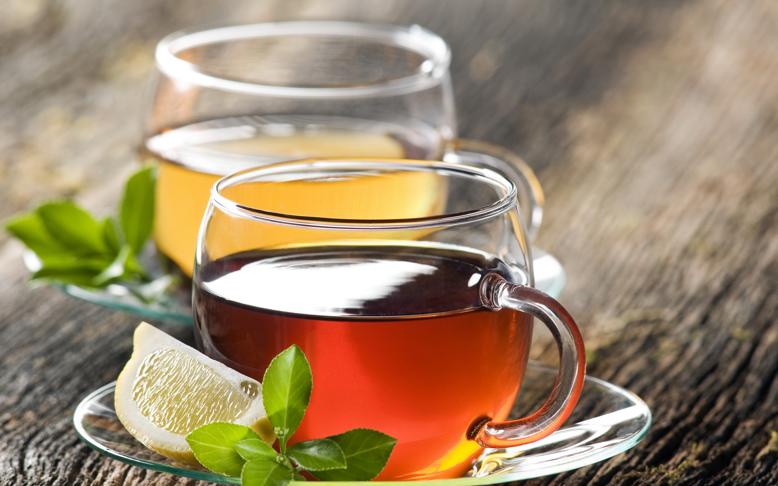 Description: Three glasses of tea with lemon slices on a plate on a wooden table with a green leaf and a slice of lemon.