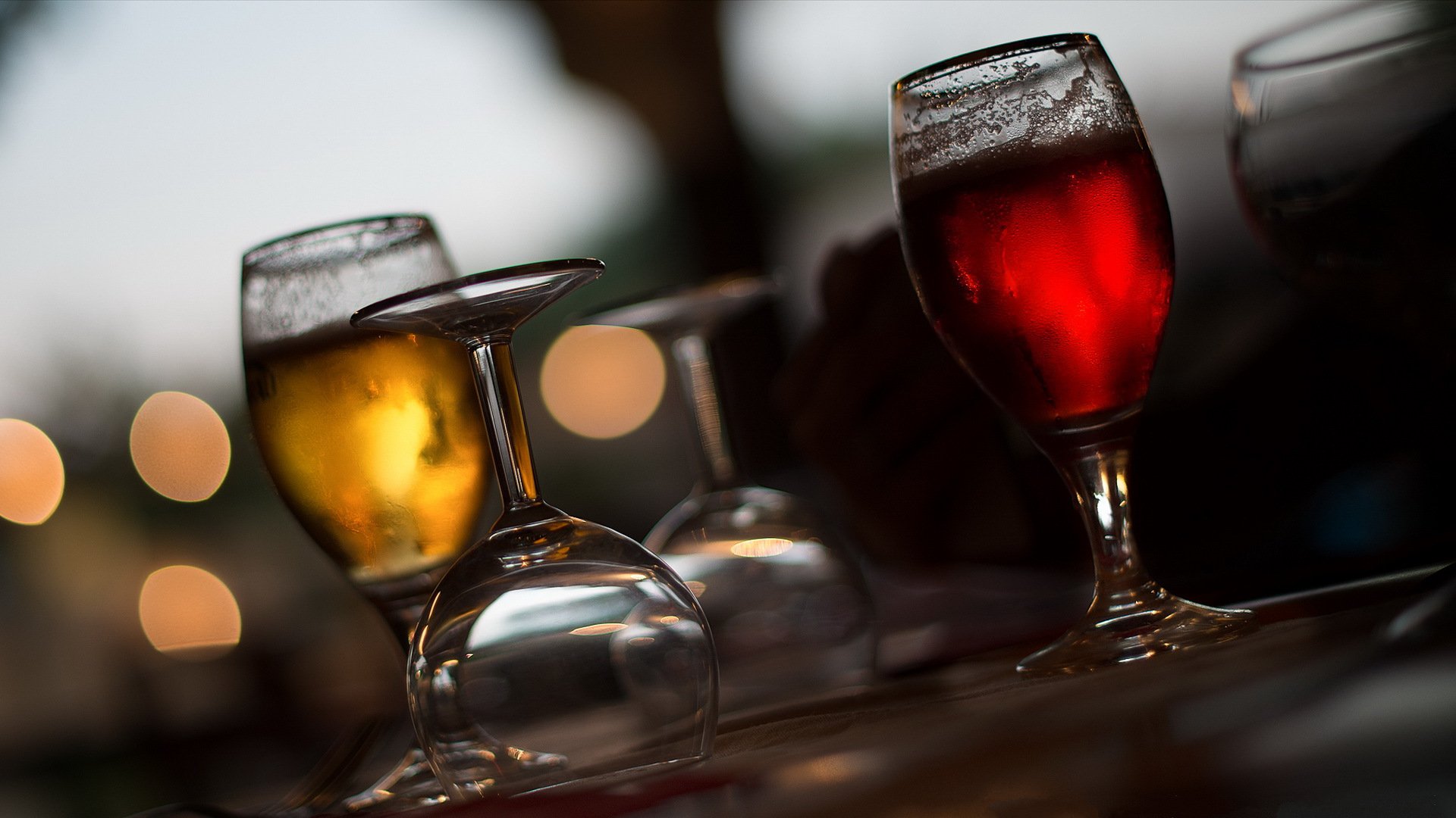 Description: Three glasses of wine are sitting on a table with lights in the background and a blurry background behind them.