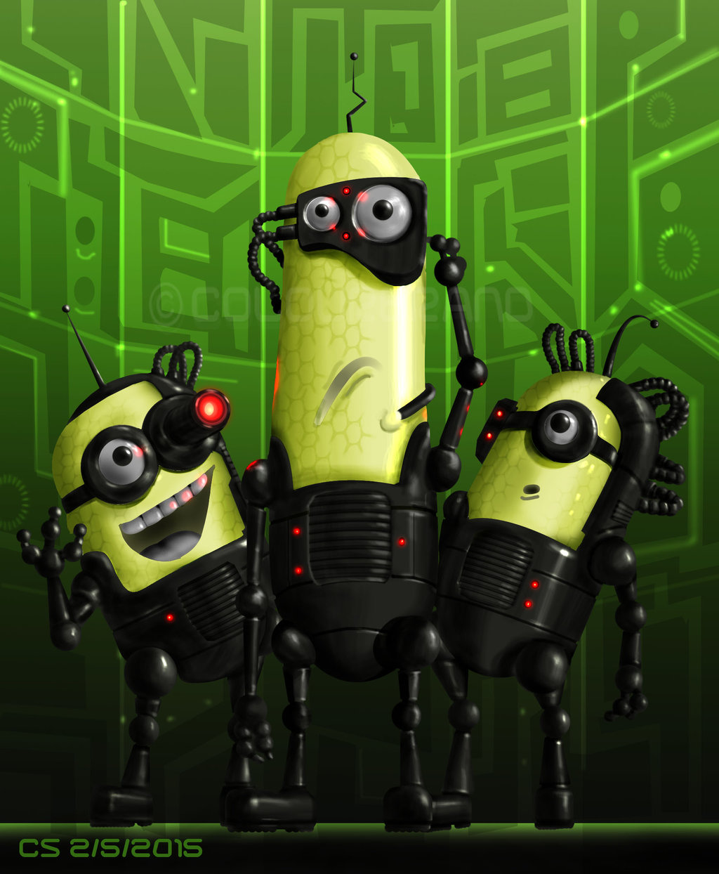 Description: A group of three little robots standing next to each other on a green background with a circuit board in the background.