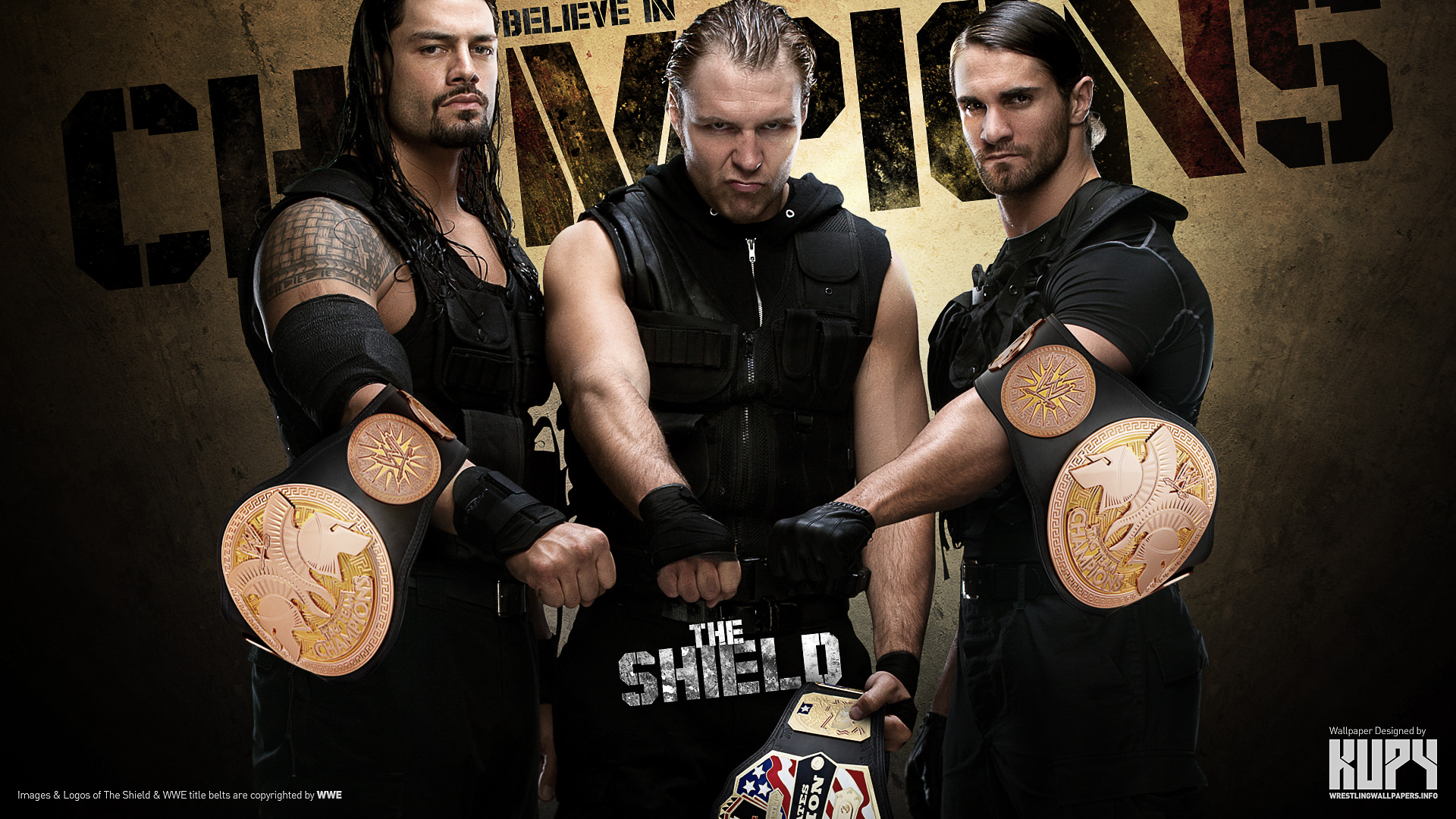 Description: Three men in black outfits holding their skateboards in their hands and the words.