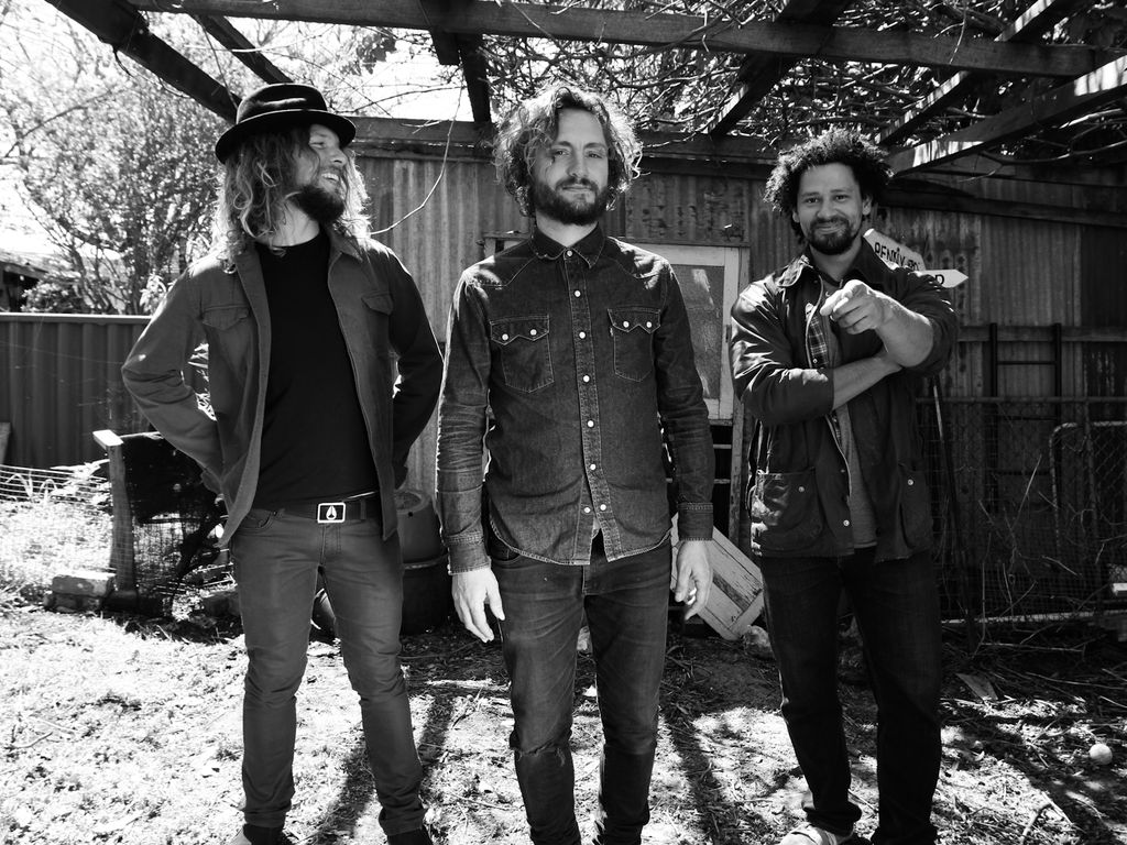 Description: Three men standing next to each other in a yard with a fence and a building in the background and a tree.