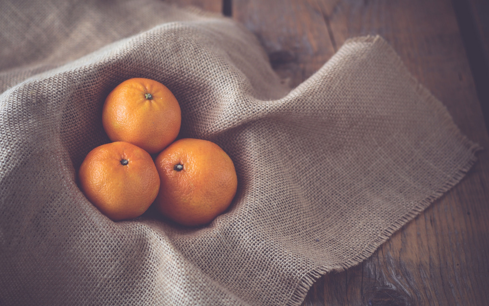 Description: Three oranges are sitting on a cloth on a tablecloth on a wooden table top.