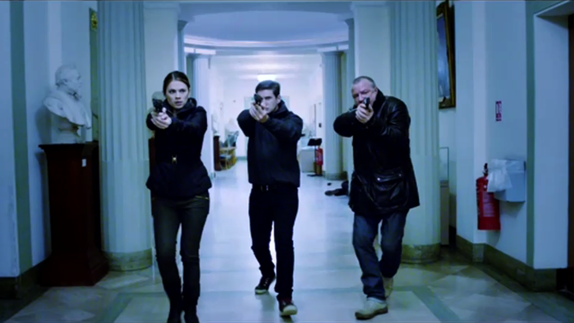 Description: Three people are walking down a hallway with guns in their hands and one person is holding a gun in his other hand.