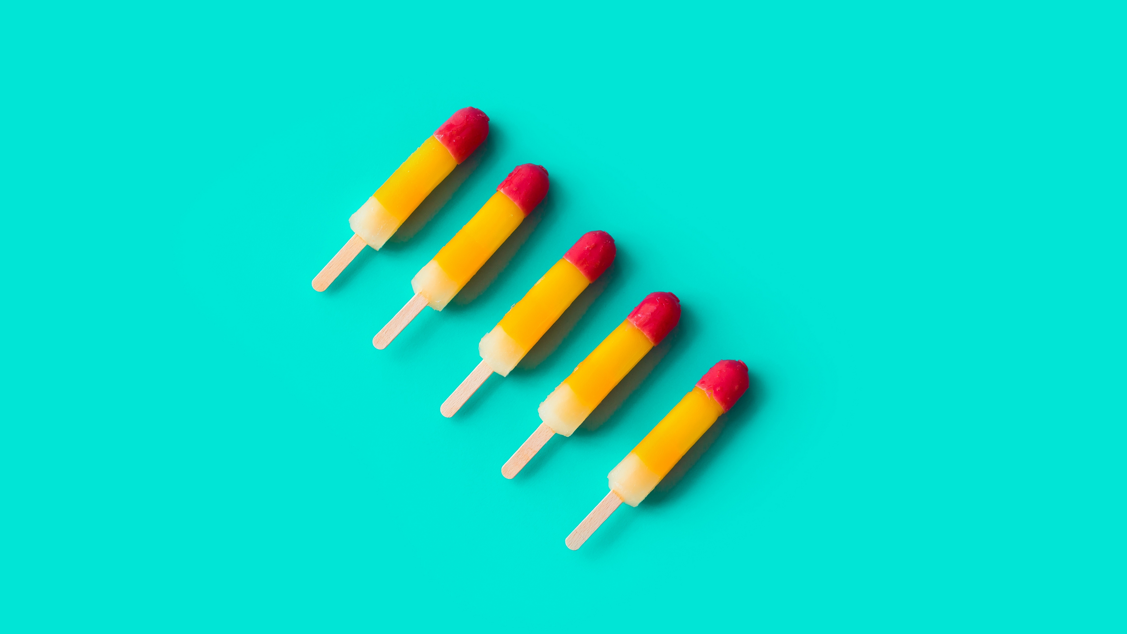 Description: Three popsicles with different colored tops on a blue background with a shadow of the popsicle on the left.