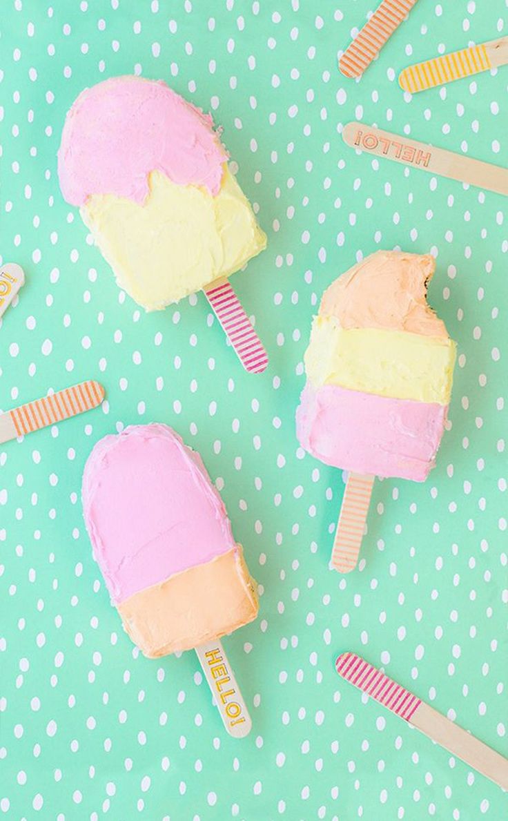 Description: Three popsicles with different colors of ice cream on them and a measuring tape on the side of them.