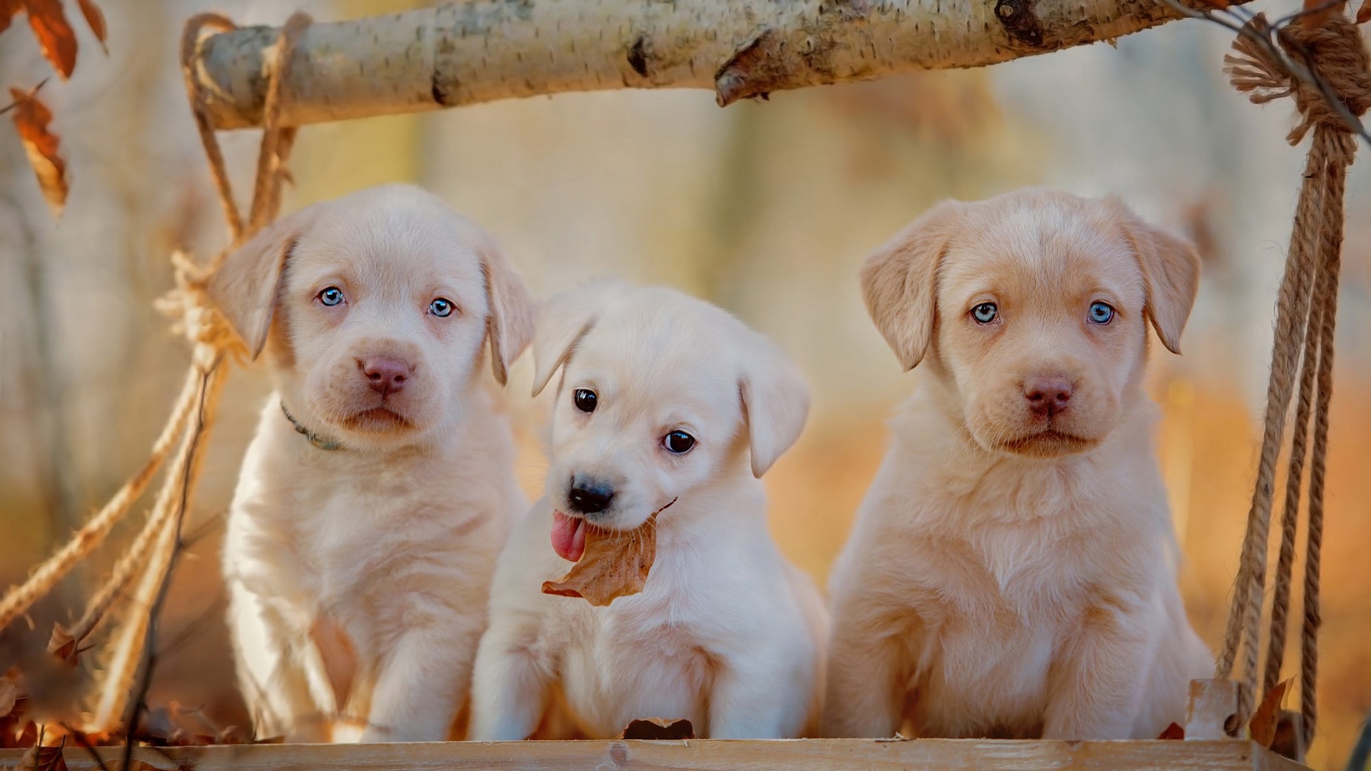 Description: Three puppies sitting on a swing in the woods with a stick in their mouth and a stick in their mouth.